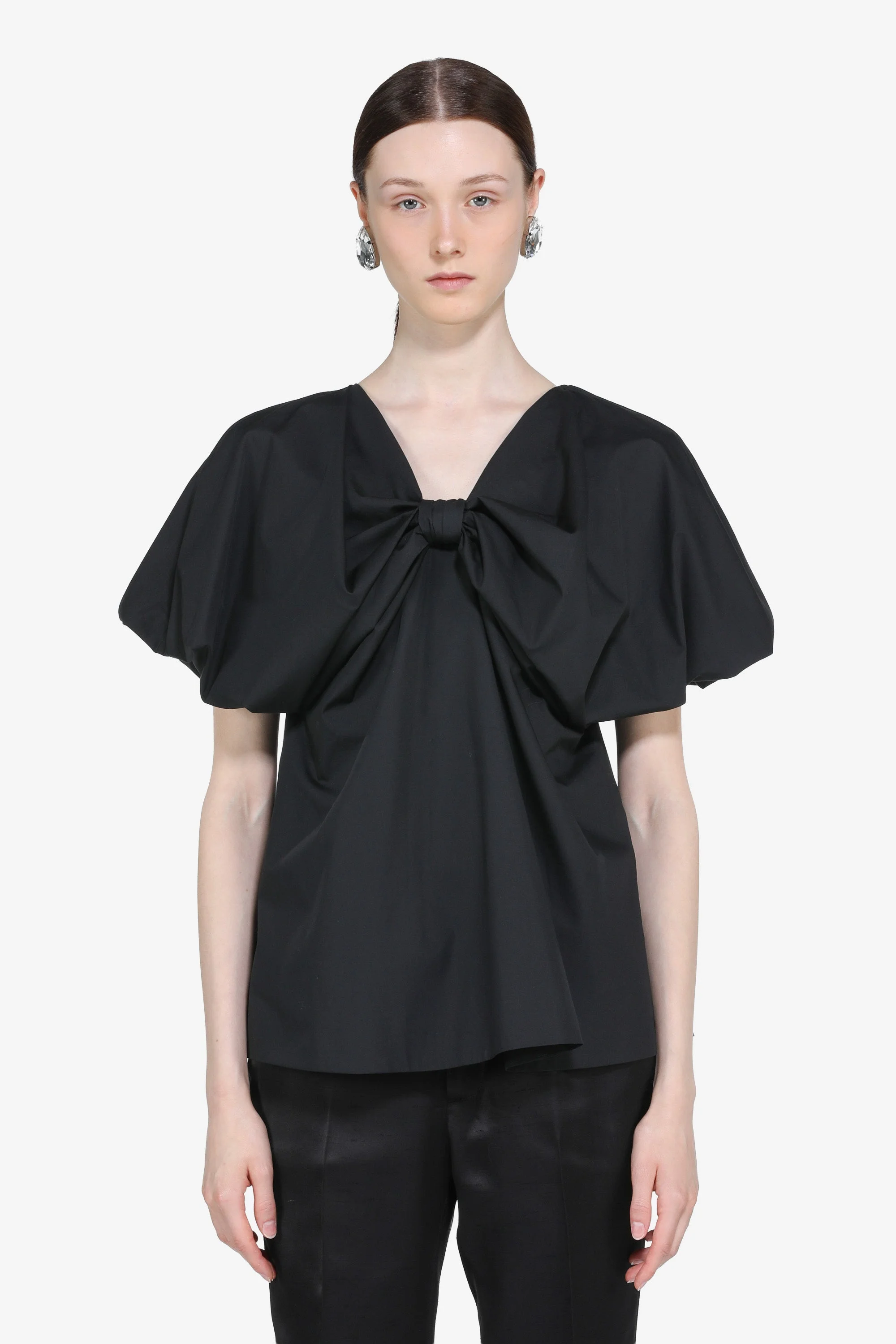 Blouse with short puff sleeves. Black. It features a large bow at the center front and a relaxed fit. The sleeves are wide, and the front features a knot that creates volume. DETAILS Color: Black Composition: 100%CO Product Code: 26EN2M0G11101879000 Made in Italy SIZE AND VESTIBILITY The model wears size 40 and is 175 cm tall. The garment fits oversized.