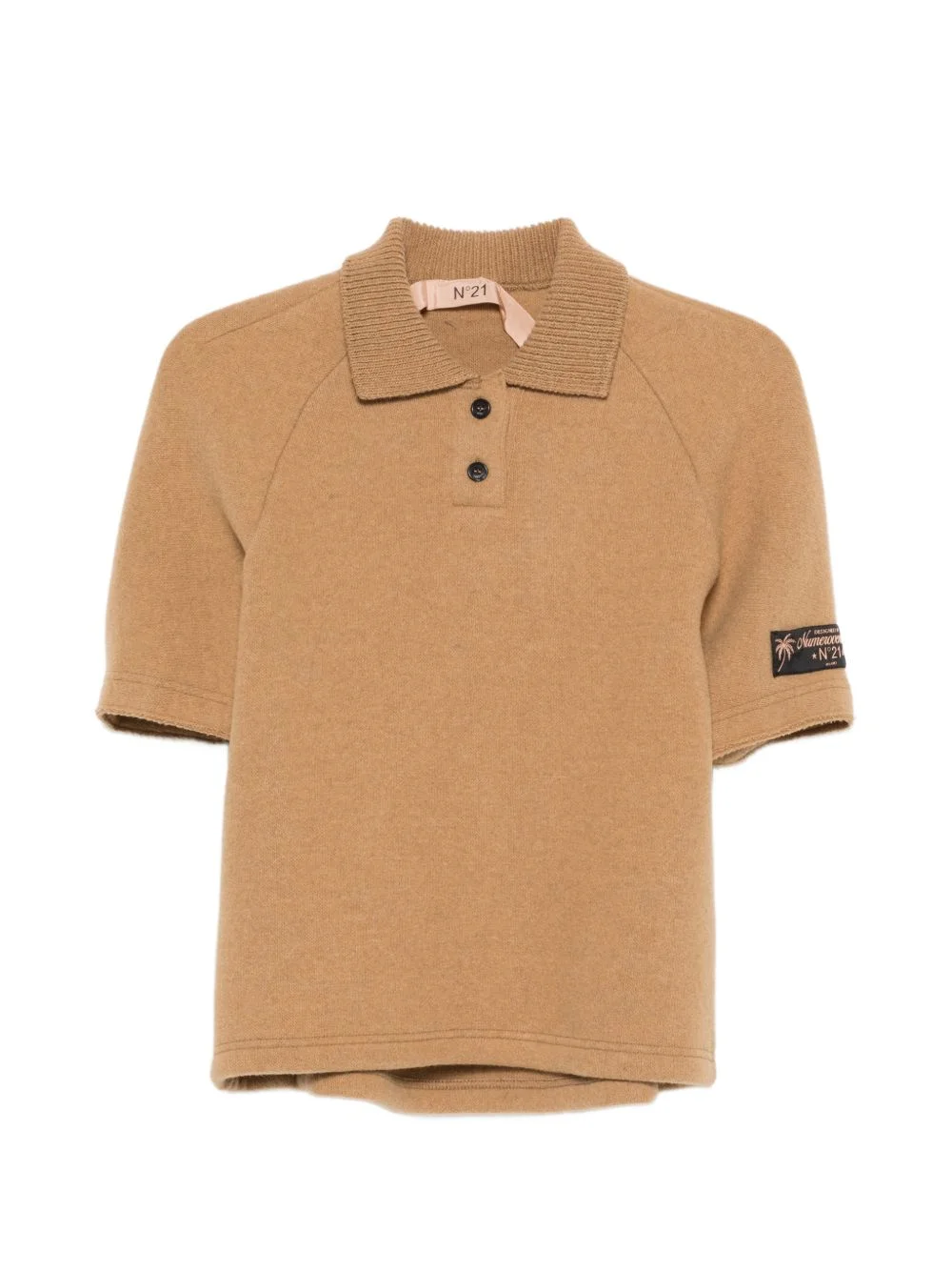 button polo knitwear Highlights - Camel - Short sleeves - Logo patch - Collar - Front button fastening - Raglan sleeves Made in Italy Composition Wool 68%, Polyester 30%, Polyamide 2% Washing instructions Read Manufacturer Guidelines