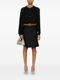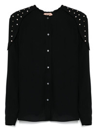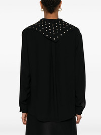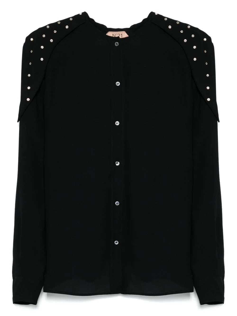 collarless shirt Highlights - Black - Front button fastening - Buttoned cuffs - Glass crystal embellishment Imported Composition Viscose 100%, glass 80%, Metal 20% SIZE & FIT Model measurements Height 5 ft 10 in(1.77 m) Bust/Chest 33.07 in(84 cm) Hips 37 in(94 cm) Waist 24.8 in(63 cm) FittingInformation Designed to be unstructured, offering a loose fit throughout Made from a lightweight non-stretch fabric Washing instructions Dry Clean Only