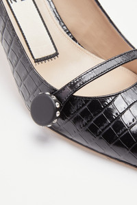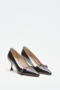 Pointed-toe pumps in a crocodile print made of synthetic material with a glossy finish. These shoes feature a tapered heel and a decorative strap closure. The insole is designed for comfort. The elegant design is suitable for both formal and casual occasions, ensuring a sophisticated look. DETAILS Color: Black External composition: 100% LAMB LEATHER Product Code: 25IGSPM007CBCN001 Made in Italy SIZE AND VESTIBILITY Measurements: 60