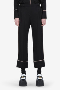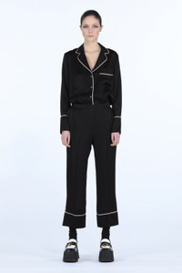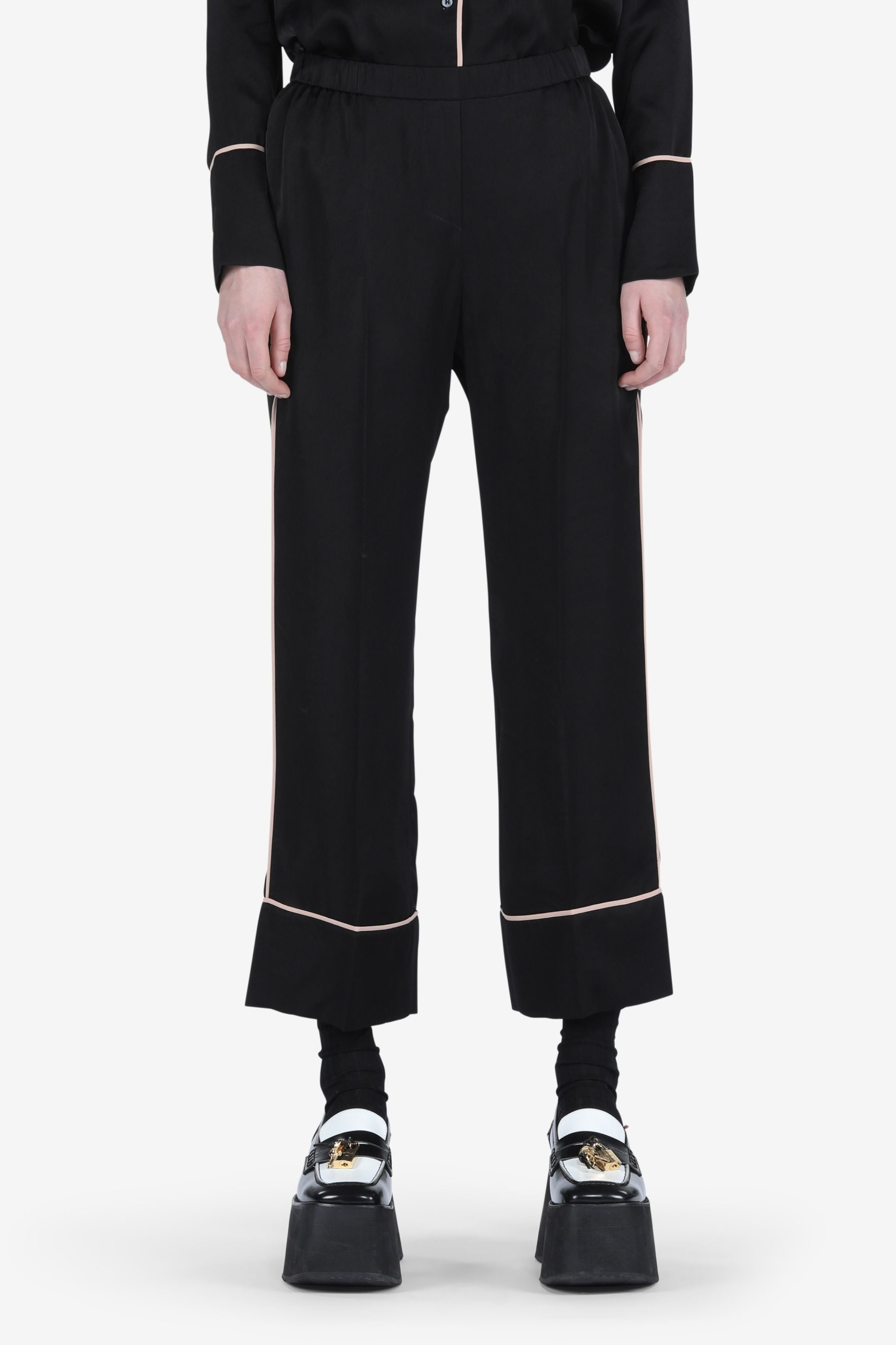 BLACK CROPPED TROUSERS WITH CONTRAST WHITE PIPING. ELASTICATED MID WAIST. PRESSED CENTRE-FRONT CREASES. WIDE TURN-UP CUFFS. MORE DETAILS RELAXED FIT 100% CUPRO DRY CLEAN ONLY STYLE ID: 22IN2M0B06150909000 SIZE AND FIT MODEL IS 177CM AND WEARS IT SIZE 40