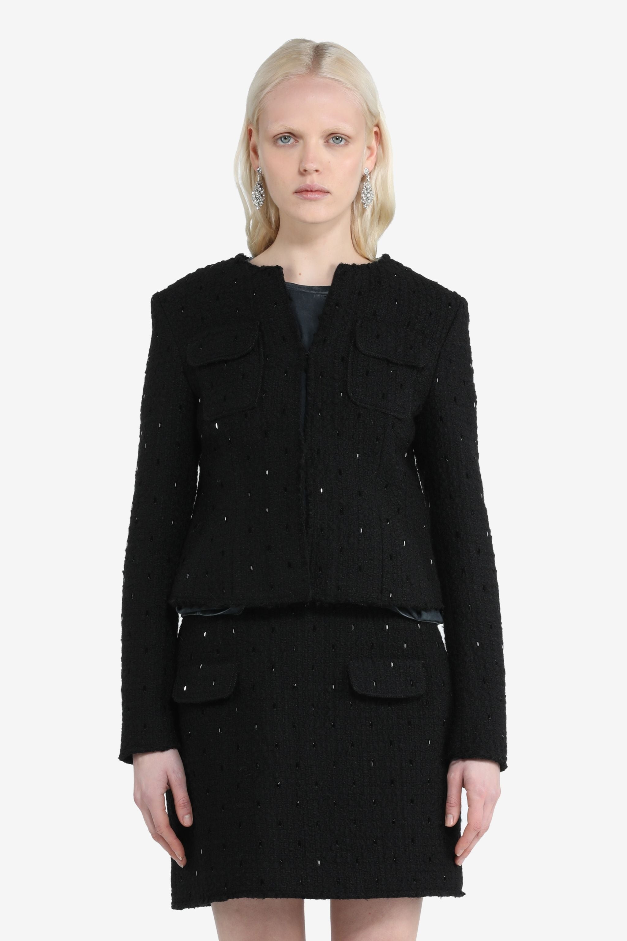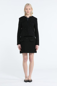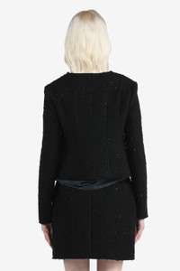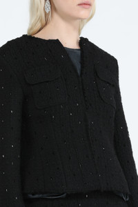 BLACK BOUCLE JACKET WITH BEAD EMBELLISHMENTS. CREW NECK. SHOULDER PADS AND LONG SLEEVES. FLAP CHEST POCKETS. CLIP FRONT FASTENING. MORE DETAILS BLACK BOXY FIT 42% ACRYLIC, 31% WOOL, 13% POLYESTER, 12% COTTON, 2% OTHER FIBRES STYLE ID: 24IN2M0L0113071 SIZE AND FIT MODEL IS 173CM AND WEARS IT SIZE 40