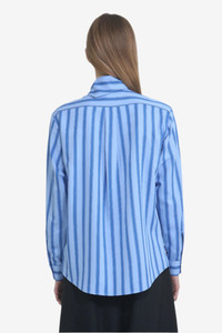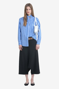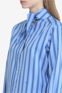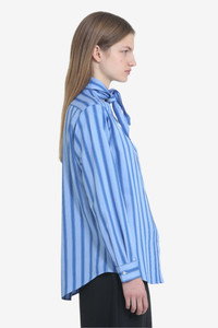 Striped shirt with bow collar in lightweight fabric, featuring a regular length and long sleeves with buttoned cuffs. The vertical stripe pattern in shades of blue gives a clean and neat look, while the bow collar adds a distinctive detail. Relaxed fit and front button fastening. DETAILS Color: Blue Striped Blue Composition: 88%VI 12%PA Product Code: 25IN2M0G0315249RD61 Made In Romania SIZE AND VESTIBILITY The model wears size 40. The garment fits regular.