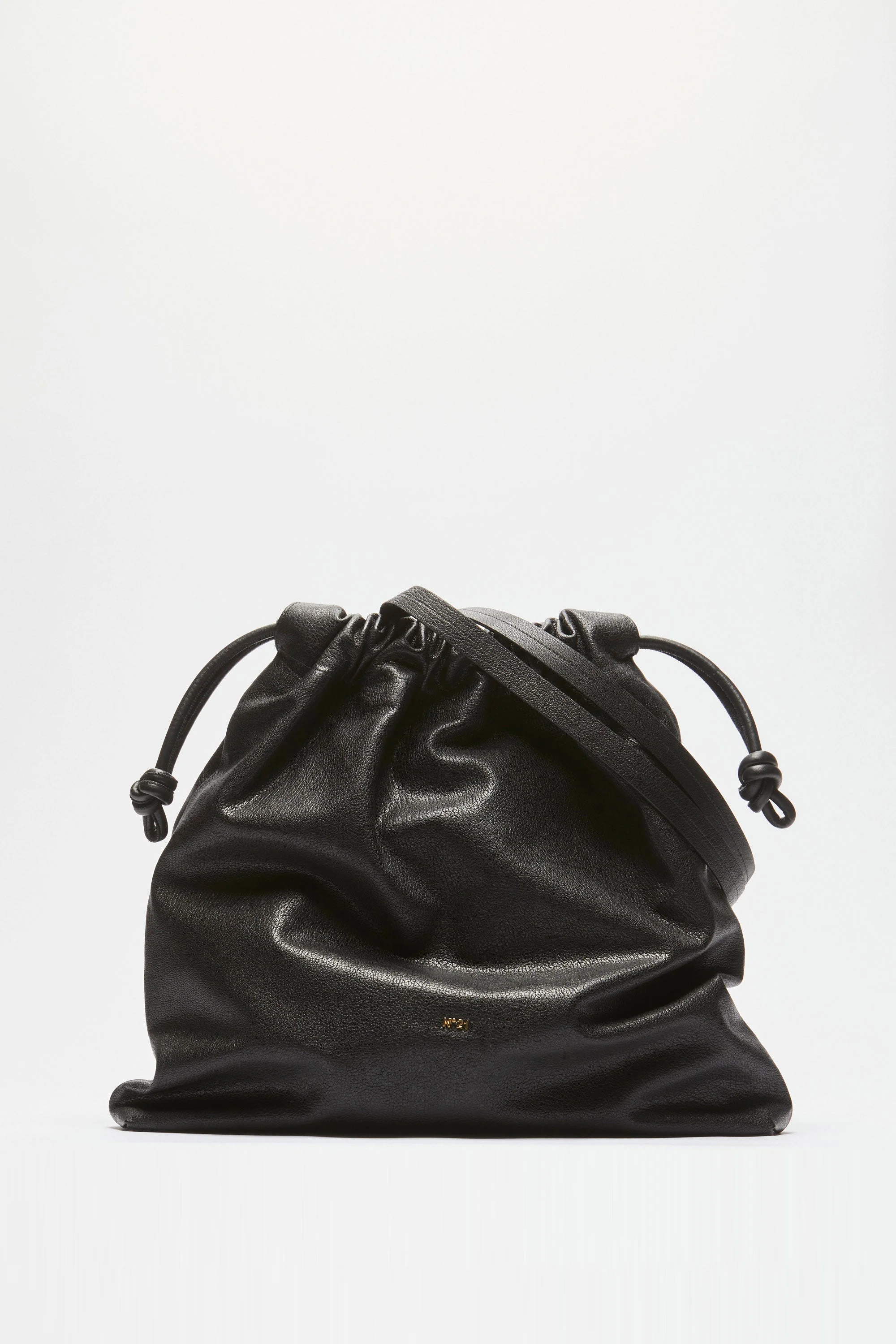 The Eva pochette bag is made of soft black leather with a smooth finish. It features a drawstring closure with two thin laces and long handles for shoulder carry. Its soft, roomy shape makes it ideal for conveniently carrying personal items. The simple structure is enhanced by a small, discreet metal applique on the front. DETAILS Color: Black External composition: 100% CALF LEATHER Product Code: 25IBP0988PR01N001 Made in Italy SIZE AND VESTIBILITY Measurements: 40x42x8
