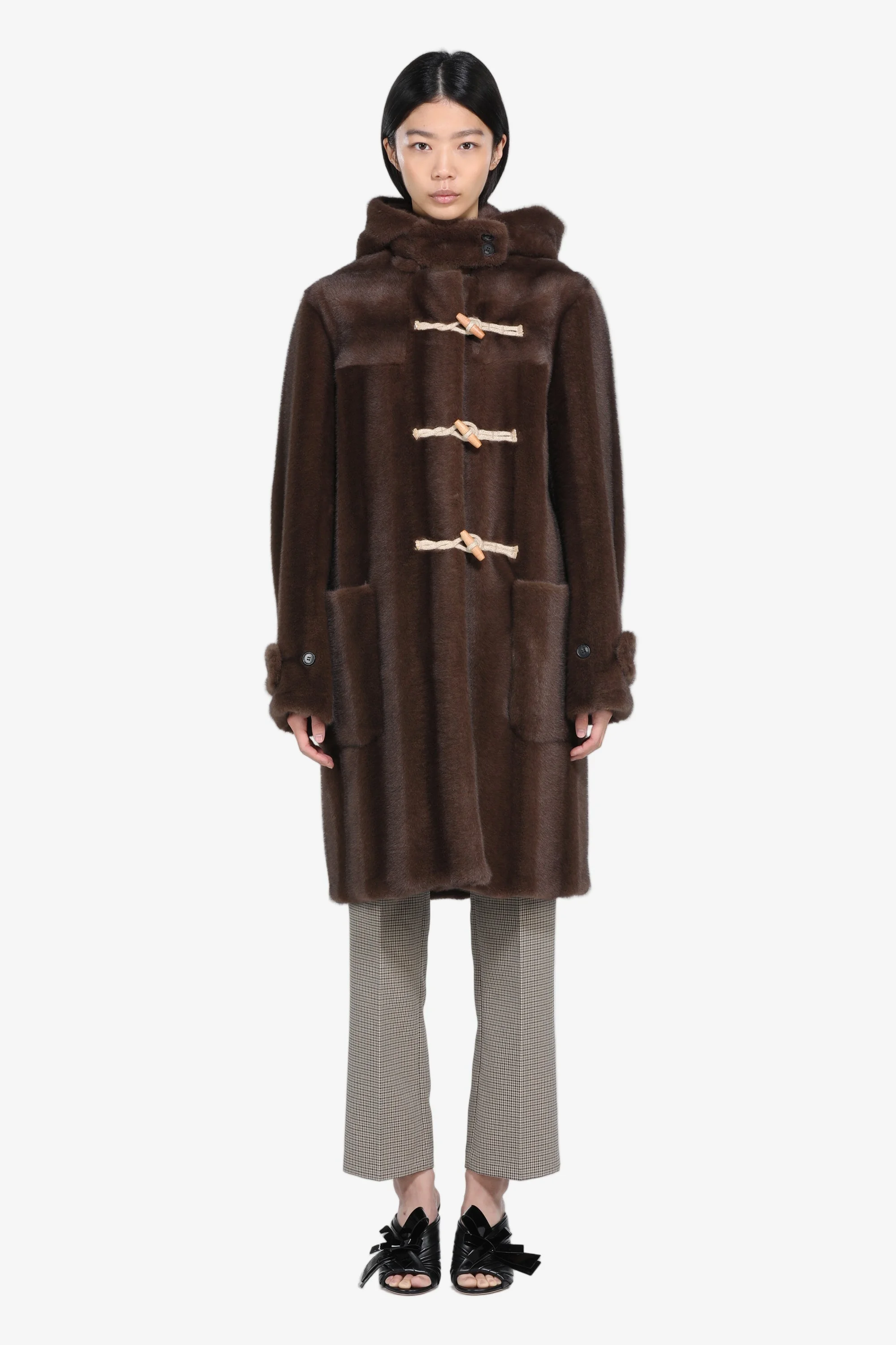 This faux fur duffle coat is a long coat made of soft, warm fabric. It features a button closure and a hood, offering comfort and protection. It has two practical front pockets and adjustable cuffs. It has a loose fit. DETAILS Color: Dark Khaki Composition: 100% PL Product Code: 25IN2S0NZ5128662221 Made in Italy SIZE AND VESTIBILITY The model wears size 40. The item fits oversized.