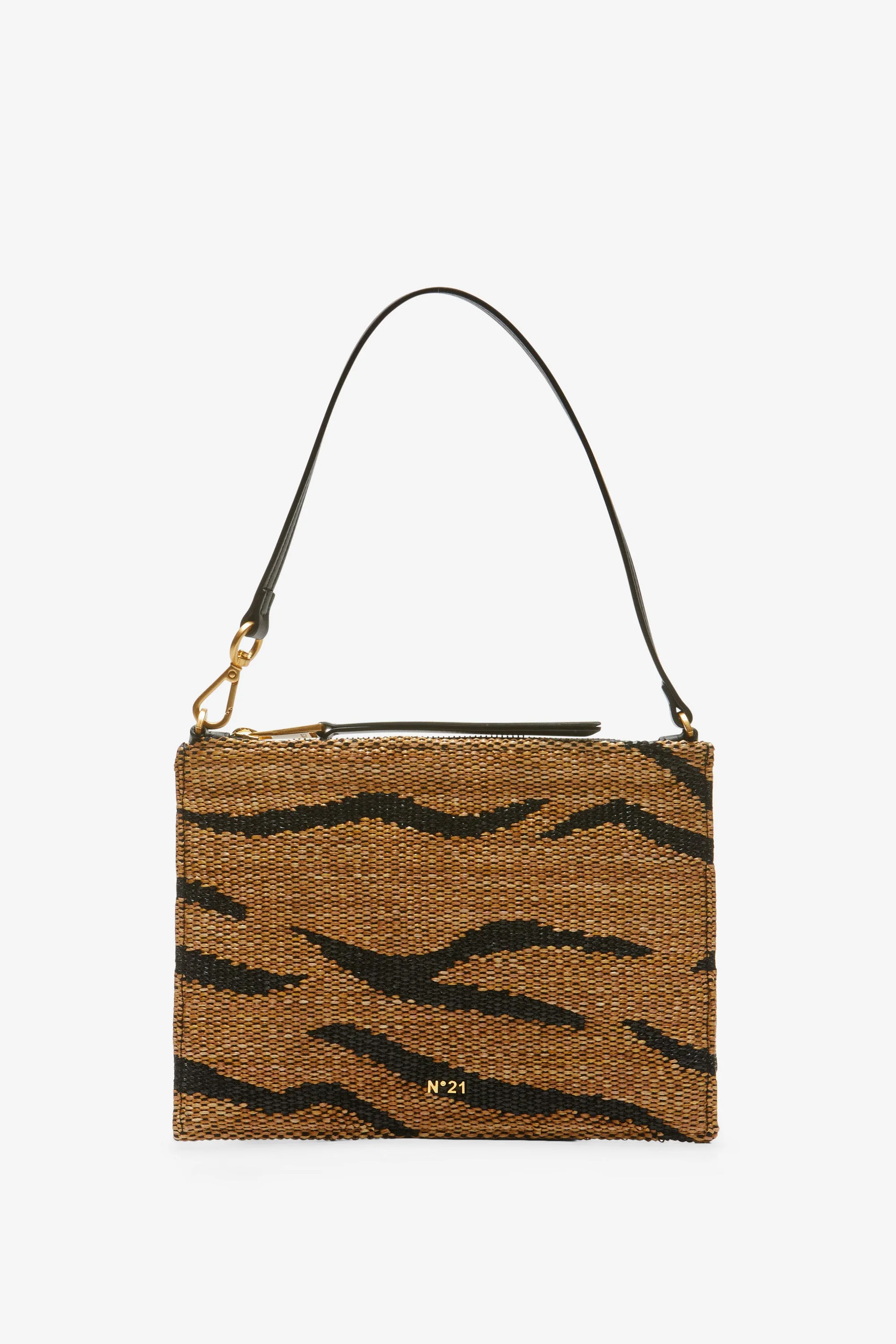 Flat clutch bag made of woven fabric with a brown and black tiger print. Rectangular and flat, it's compact enough to hold your essentials. It closes with a zip at the top, and the black leather shoulder strap is attached with gold hooks. DETAILS Color: Tiger Print External composition: 40% PA 20% CO 40% CALF LEATER Product Code: 26EBP0990RSZ1X002 Made in Italy