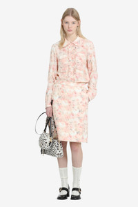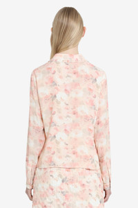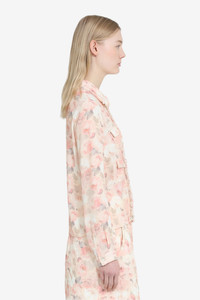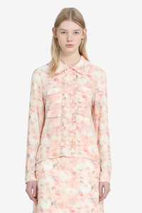Floral shirt with mini ruffles and pockets made of light and soft fabric. It features a floral pattern in shades of pink and beige, a classic collar and a front button closure. The fit is regular, with long sleeves and pleated details along the button placket and collar. The shirt includes four small patch pockets on the front. DETAILS Color: Butter Background Print Composition: 100%VI Product Code: 25IN2M0G0525263SAR1 Made In Italy SIZE AND VESTIBILITY The model wears size 40. The garment fits regular.