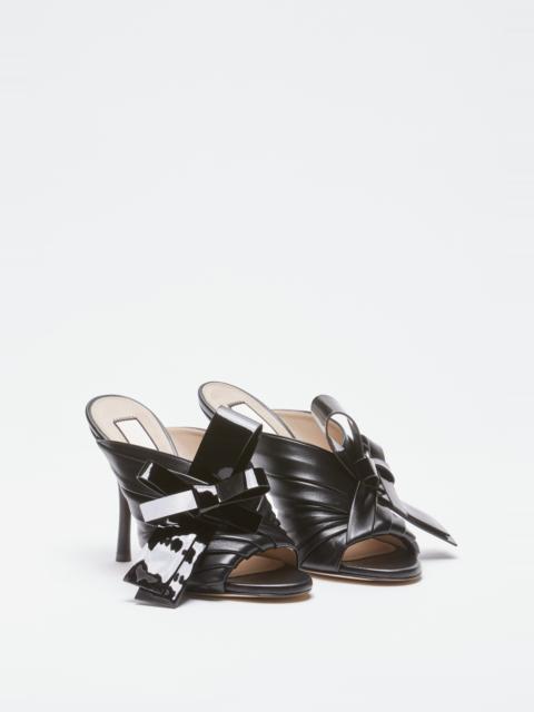 These high-heeled mules are crafted from a soft, lightweight fabric and feature an elegant design with a decorative bow. The upper features a gathered effect, while the slim heel offers stable and comfortable support. DETAILS Color: Nude External composition: 100% LAMB LEATHER Product Code: 25IGSSD008NCCC001 Made in Italy SIZE AND VESTIBILITY Measurements: 100
