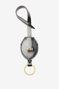 Logo keychain made of black leather with hand-stitched finishes. It features a gold-tone metal ring for easy key attachment. The compact and lightweight structure features a simple, functional design. The metal logo is applied to the main body, adding a distinctive detail. DETAILS Color: Black External composition: 100% CALF LEATHER Product Code: 25IBP0991SZ01N001 Made in Italy SIZE AND VESTIBILITY Dimensions: 26x4.5