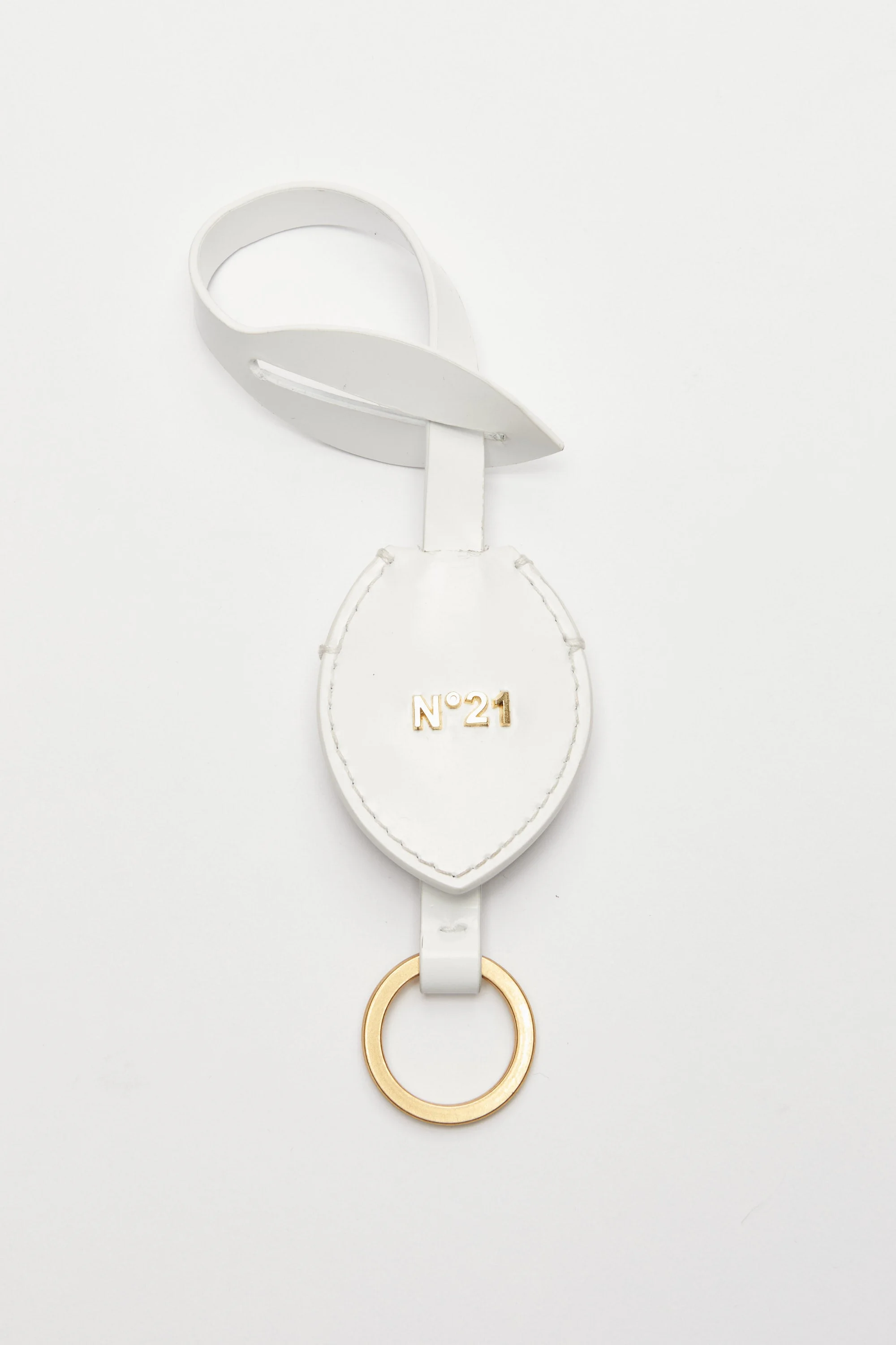 Logo keychain made of white leather with exposed stitching and gold-tone hardware. It features an oval shape with a circular metal key ring. The design includes a knot detail that allows it to be easily attached to bags or belts. The logo is embossed on the front with a gold finish. DETAILS Color: White External composition: 100% CALF LEATHER Product Code: 25IBP0991SZ01W001 Made in Italy SIZE AND VESTIBILITY Dimensions: 26x4.5