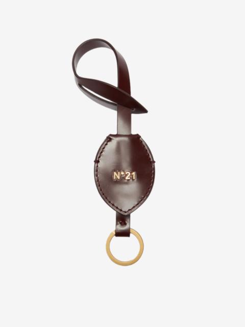 Logo keychain made of brown leather with a glossy finish. It features an oval-shaped structure with prominent stitching along the edges and a gold-tone metal ring to secure keys. The design includes a metal detail with the N°21 logo positioned in the center of the oval. The leather strap allows for easy grip and carrying. DETAILS Color: Bordeaux External composition: 100% CALF LEATHER Product Code: 25IBP0991SZ01R005 Made in Italy SIZE AND VESTIBILITY Dimensions: 26x4.5