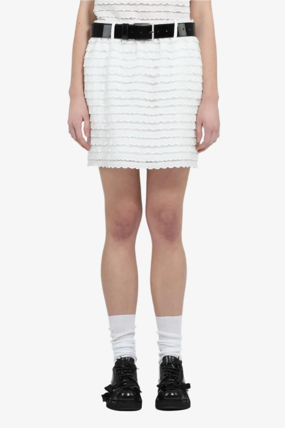 Short white lace skirt with horizontal flounces. Contrasting black belt at the waist. Side zip closure. DETAILS Color: Cream Composition: 50%PA 50%CO Product Code: 25IN2C0C09152011102 SIZE AND VESTIBILITY FIT TRUE TO SIZE