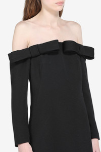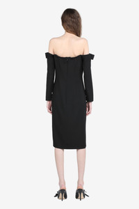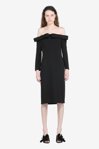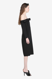 This long-sleeved dress features off-the-shoulder styling and is crafted from a soft, textured fabric. It has a slim fit that flatters the figure, with an elegant and understated design. The back closure makes it easy to put on, while the collar detail adds a distinctive touch. Ideal for special occasions or elegant evenings, this dress combines comfort and style. DETAILS Color: Black Composition: 100% VI Product Code: 25IN2S0H08150759000 Made in Italy SIZE AND VESTIBILITY The model wears size 40. The garment fits regular.