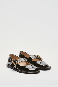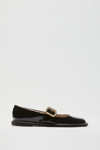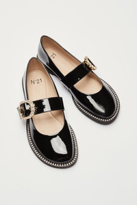 Black patent leather Mary Jane with rhinestones and a buckle closure decorated with sparkling details. The shoe features a flat sole and a classic cut that ensures a snug and comfortable fit. DETAILS Color: Black External composition: 100% CALF LEATHER Product Code: 25IGPBL018VE1N001 Made in Italy SIZE AND VESTIBILITY Heel size: 10
