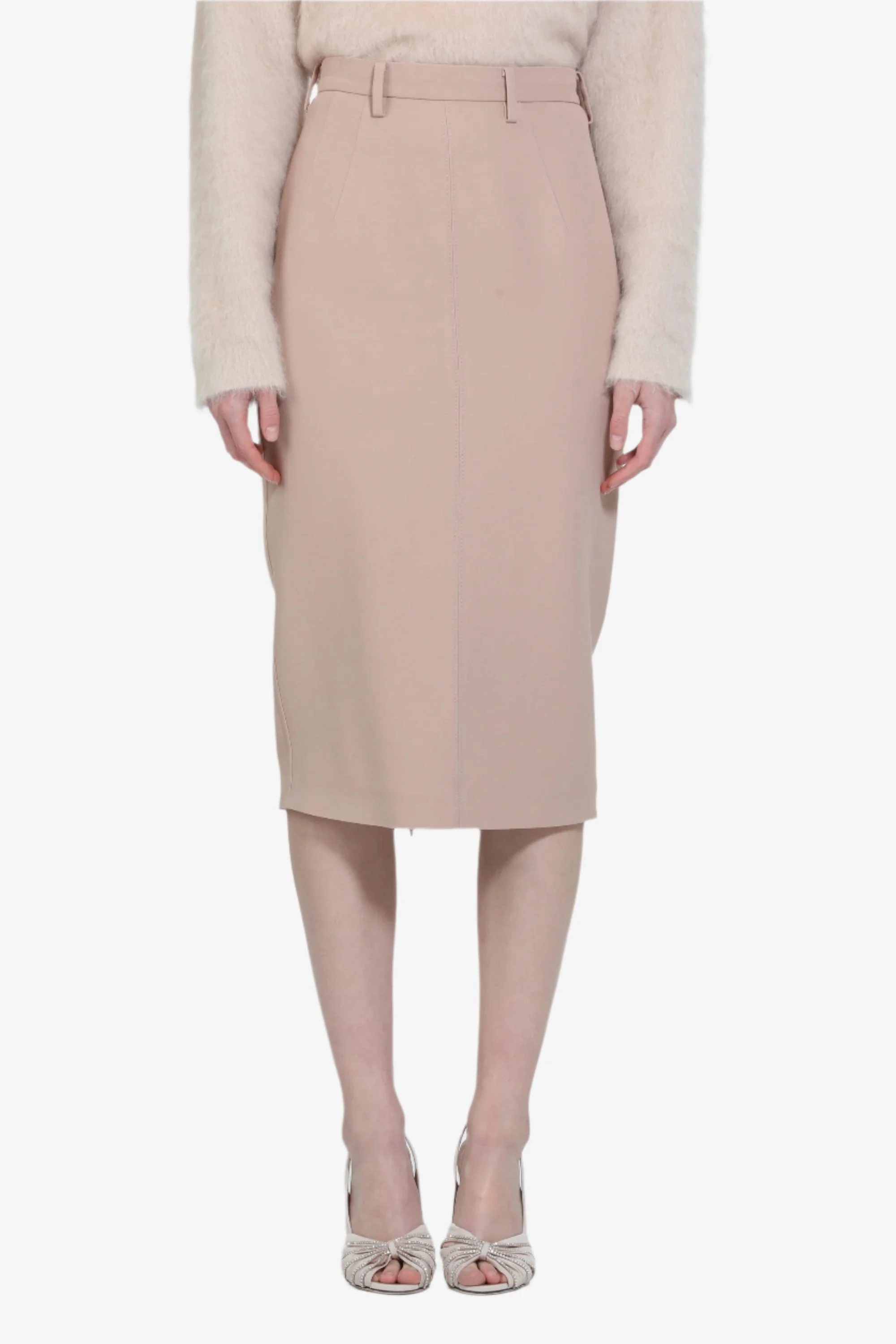 Midi pencil skirt made of smooth and compact beige fabric. It features an invisible zip closure on the back and belt loops at the waist. The cut is tight and linear, with vertical seams that define the silhouette. Below the knee length. DETAILS Color: Powder Composition: 50%AC 50%VI Product Code: 25IN2M0C01153364151 Made In Italy SIZE AND VESTIBILITY The model wears size 40. The garment fits regular.