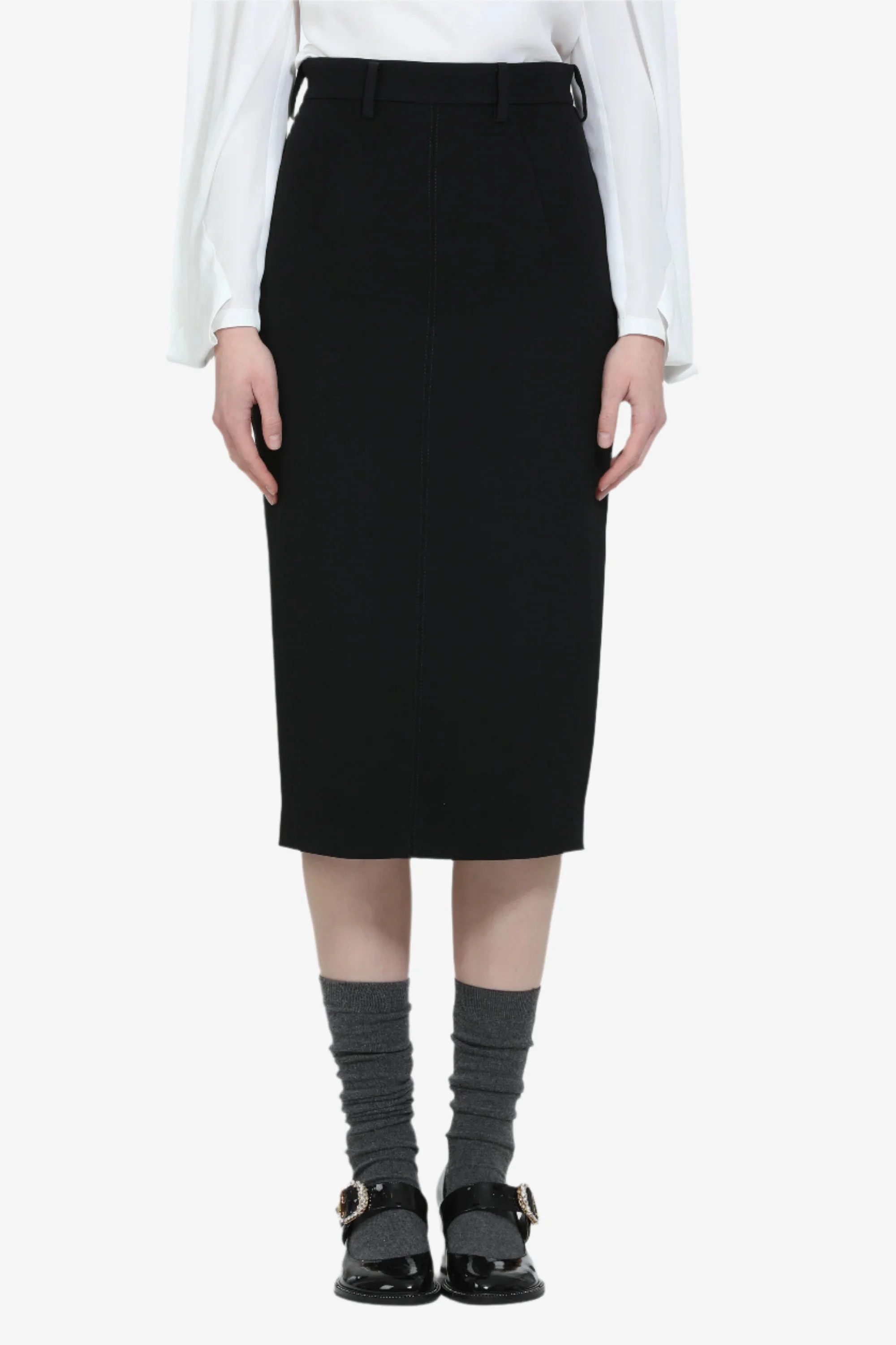 Midi pencil skirt made of black fabric with a slim fit that follows the body line. The skirt has a calf length and a simple construction with center seams at the front and back. Equipped with a belt with belt loops and an invisible zip closure at the back, it offers a classic cut. DETAILS Color: Black Composition: 50%AC 50%VI Product Code: 25IN2M0C01153369000 Made In Italy SIZE AND VESTIBILITY The model wears size 40. The garment fits regular.