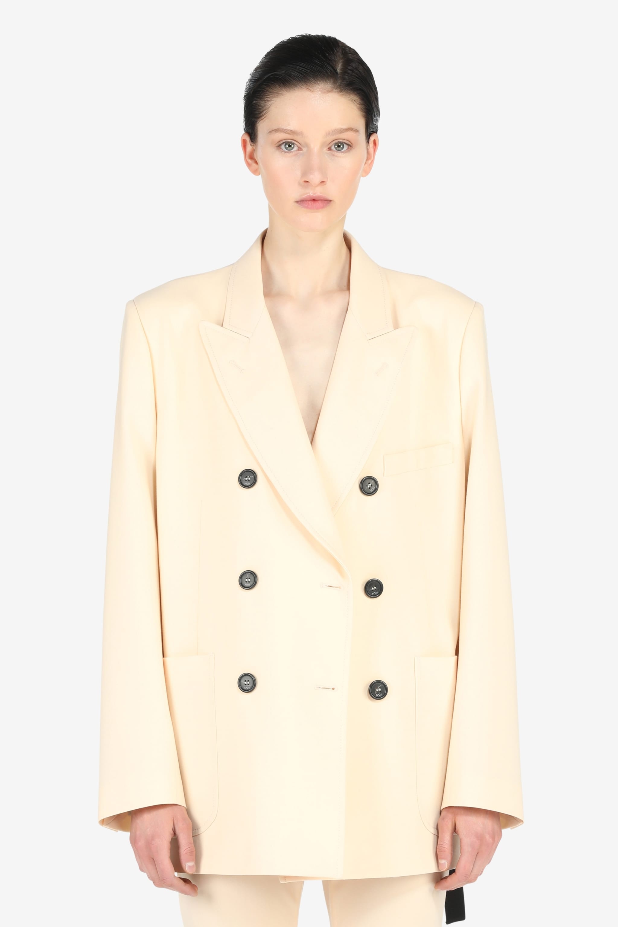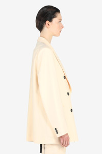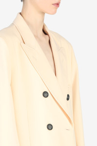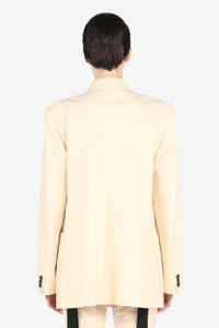 PALE-YELLOW WOOL-BLEND BLAZER WITH WIDE PEAK LAPELS. LONG SLEEVES WITH BUTTON CUFFS. WELT CHEST POCKET AND PATCH FRONT POCKETS. FULLY LINED. INTERNAL SHOULDER STRAPS WITH BUTTON FASTENING. DOUBLE-BREASTED BUTTON FASTENING. MORE DETAILS PALE YELLOW OVERSIZED FIT 53% POLYESTER, 43% WOOL, 4% ELASTANE; LINING: 100% VISCOSE DRY CLEAN ONLY MADE IN ITALY STYLE ID: 23EN2S0L02130351228 SIZE AND FIT MODEL IS 179CM AND WEARS IT SIZE 40