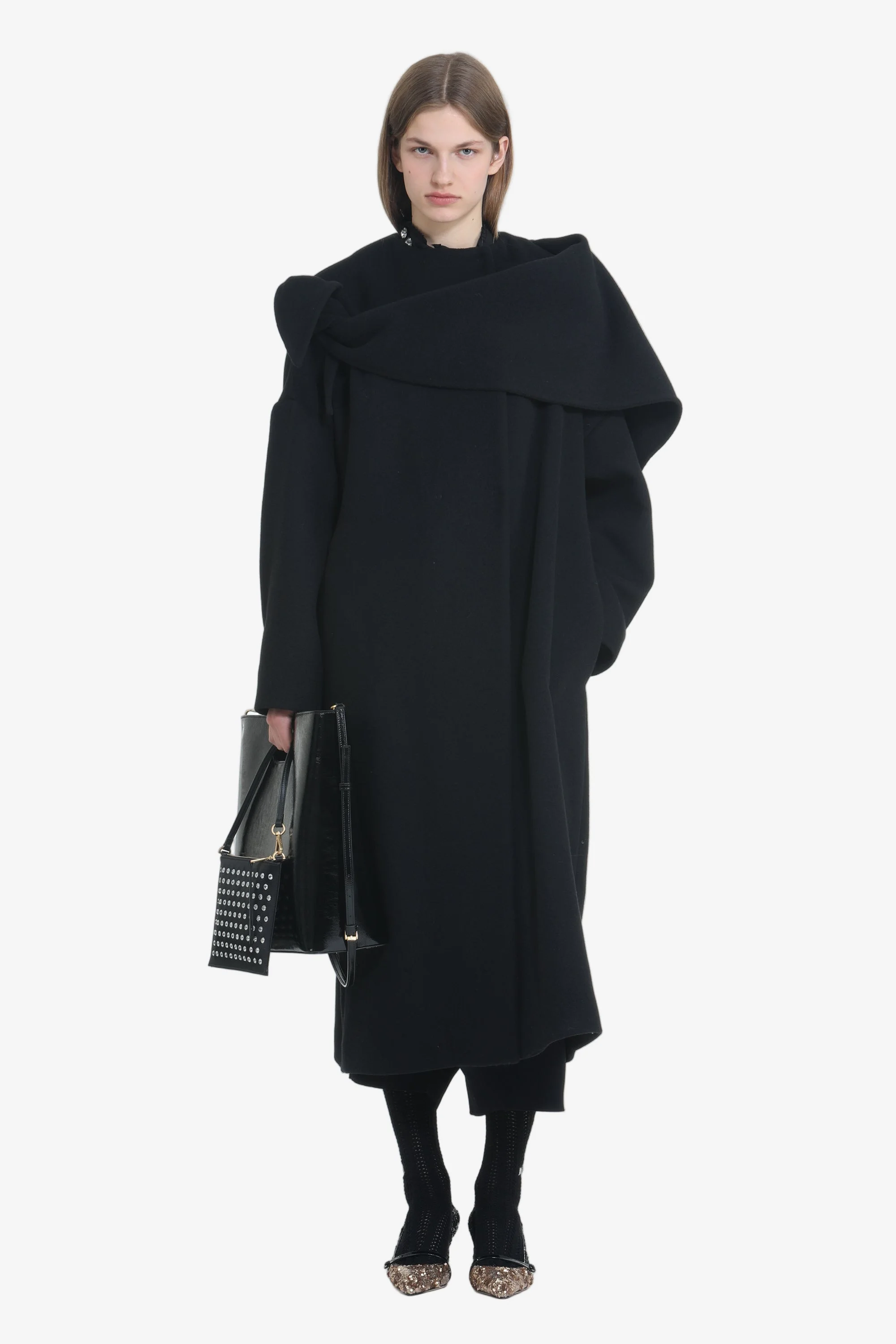 Oversized long coat with attached shawl made of thick black fabric. The fit is loose and comfortable, with long sleeves and a hidden front closure. The design features a minimalist construction with clean lines and a shawl detail that extends from the shoulder. Ideal for a contemporary and functional look. DETAILS Color: Black Composition: 50%WO 24%PC 22%PL 3%CO 1%WV Product Code: 25IN2M0N03130629000 Made in Italy SIZE AND VESTIBILITY The model wears size S. The item fits oversized.