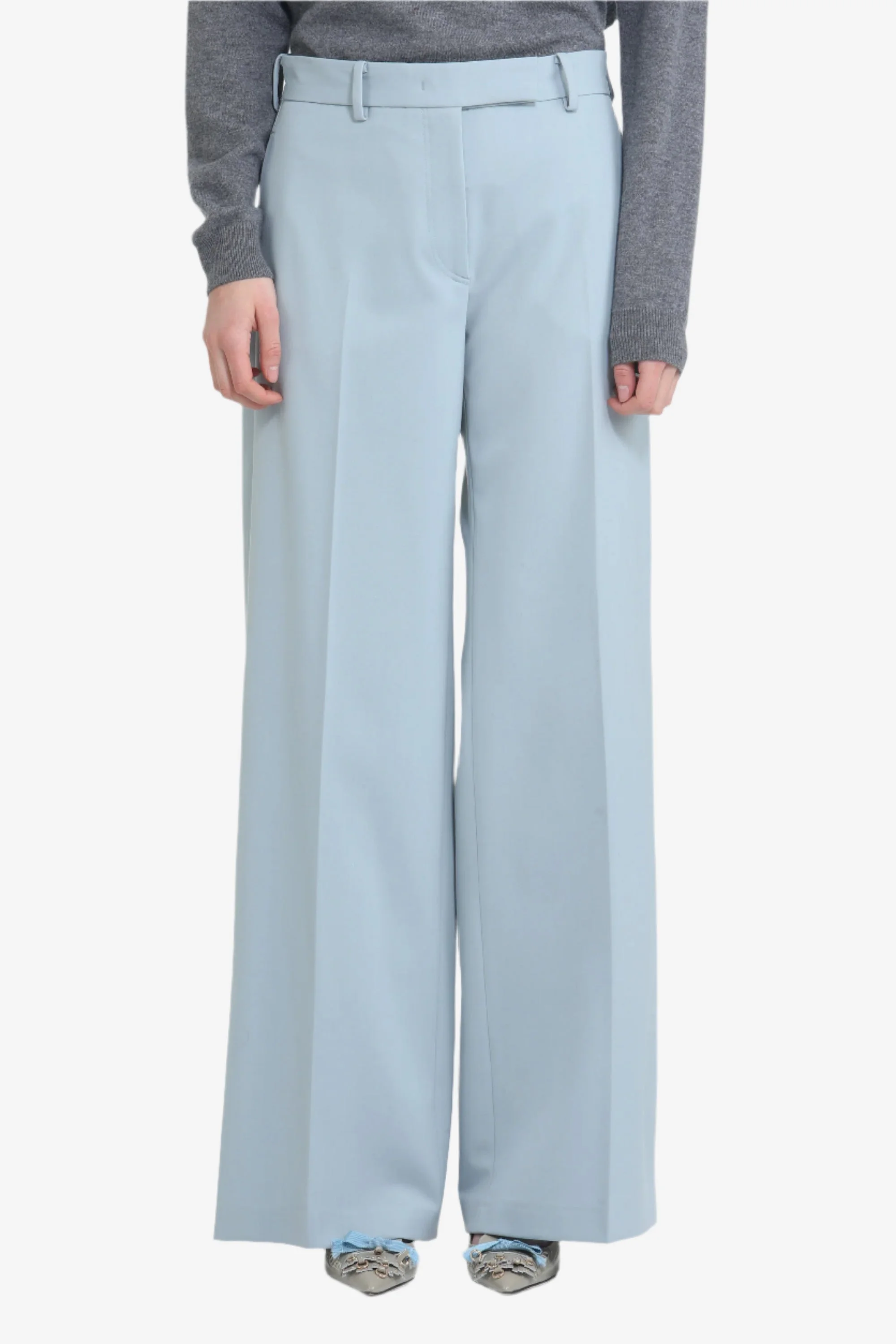 Palazzo pants with belt loops made of light blue fabric. They have a loose and fluid fit with a straight line and full length. The construction includes back welt pockets and a hidden front closure. DETAILS Color: Sky Blue Composition: 53%PL 43%WO 4%EA Product Code: 25IN2M0B04230476619 Made In Italy SIZE AND VESTIBILITY The model wears size 40. The item fits oversized.