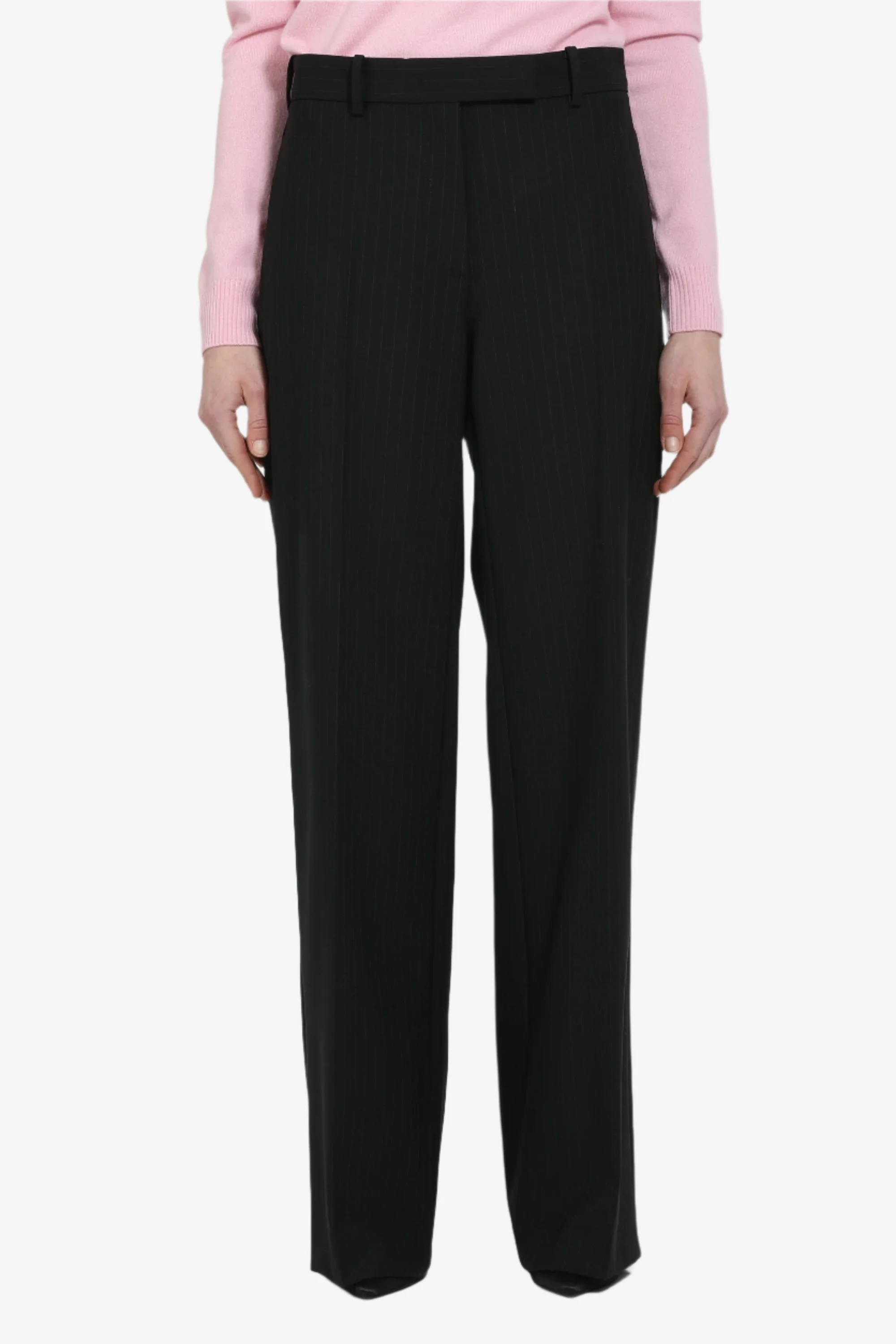 Palazzo trousers with belt loops in striped fabric made from lightweight fabric with a thin stripe pattern. They feature a loose and fluid fit characteristic of the palazzo cut, with a high waist and belt loops. The construction includes back welt pockets and a concealed front zip fastening. DETAILS Color: Black Background White Stripes Composition: 53%PL 43%WO 4%EA Product Code: 25IN2M0B0415248R911 Made In Italy SIZE AND VESTIBILITY The model wears size 40. The item fits oversized.