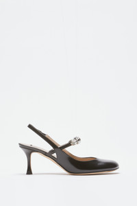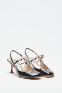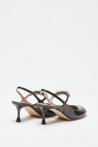 These patent leather Mary Jane slingbacks are elegantly designed shoes crafted from shiny leather. They feature a medium heel and a strappy closure for a secure fit. The rounded toeline features a decorative detail on the upper, adding a touch of sophistication. These shoes are ideal for special occasions and can be easily paired with a variety of outfits. DETAILS Color: Black External composition: 100% CALF LEATHER Product Code: 25IGSSB014SZCN001 Made in Italy SIZE AND VESTIBILITY Measurements: 60