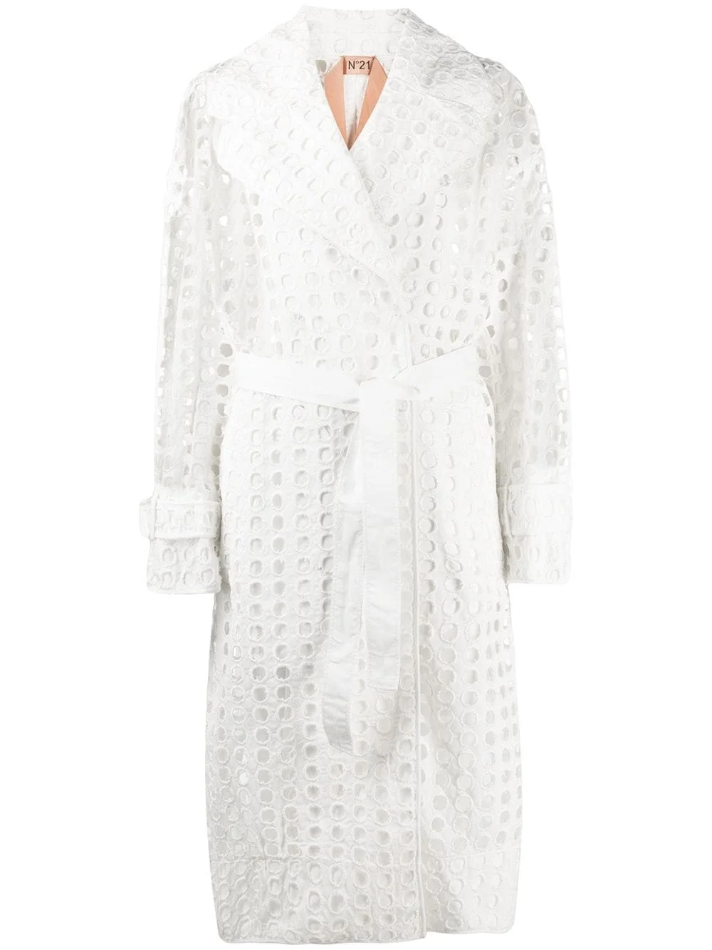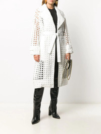 perforated-design midi coat They say people often fall in love with things they can't have. But now that you're (totally) in love with this perforated coat, you should know it’s up to you to make it yours, truly and forever. Nº21 will always help you fulfil your dreams. Highlights - White - Fully perforated - Belted waist - Straight hem - Notched lapels - No fastening - Long sleeves - Two side slit pockets - Mid-length Made in Italy Composition Polyester 100% SIZE & FIT Model measurements Height 5 ft 10 in(1.77 m) Bust/Chest 33.46 in(85 cm) Hips 35.43 in(90 cm) Waist 26.77 in(68 cm) Washing instructions Dry Clean Only