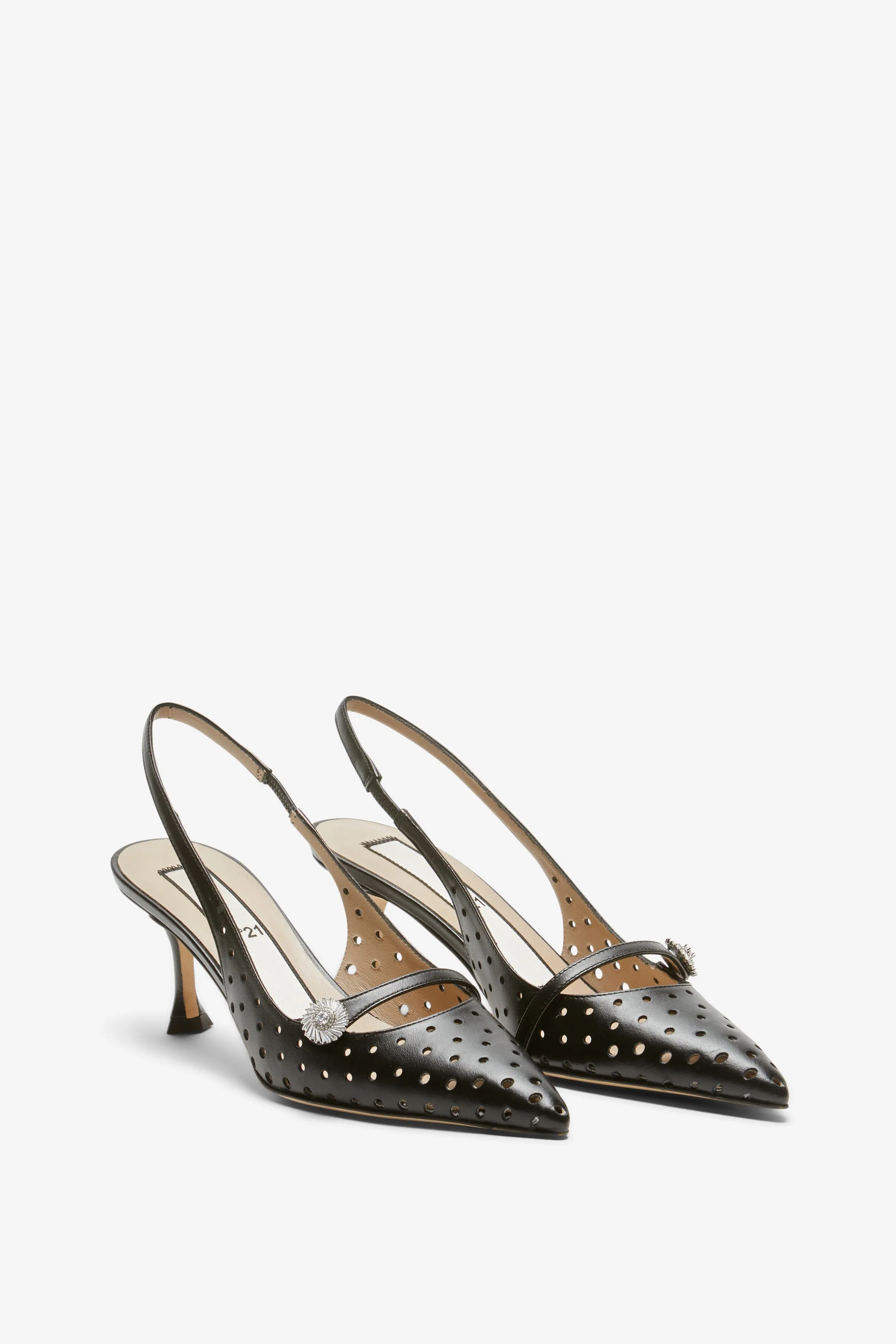 Closed-toe slingbacks with a perforated black leather upper. Elastic ankle strap with a jeweled buckle. The heel is medium and the sole is smooth. The lining is light. DETAILS Color: Black External composition: 100% CALF LEATHER Product Code: 26EGPSB018VTTN001 Made in Italy