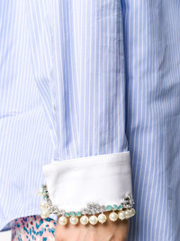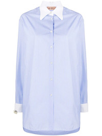 pinstriped long-line shirt Bring some glitz into your daily looks with this blue cotton pinstriped longline shirt from Nº21, complete with pearl and crystal embellished cufs. Impossible to resist, right? Get it, you won't regret it. Featuring a pointed collar, a front button fastening, a curved hem and crystal and pearl embellished cuffs. Made in Italy Composition Cotton 100%, Acetate 69%, Silk 31% SIZE & FIT Model measurements Height 5 ft 11 in(1.8 m) Bust/Chest 33.07 in(84 cm) Hips 37.4 in(95 cm) Waist 25.19 in(64 cm) FittingInformation This piece fits true to size. We recommend you get your regular size Cut for a loose fit Made with a mid-weight non-stretch fabric