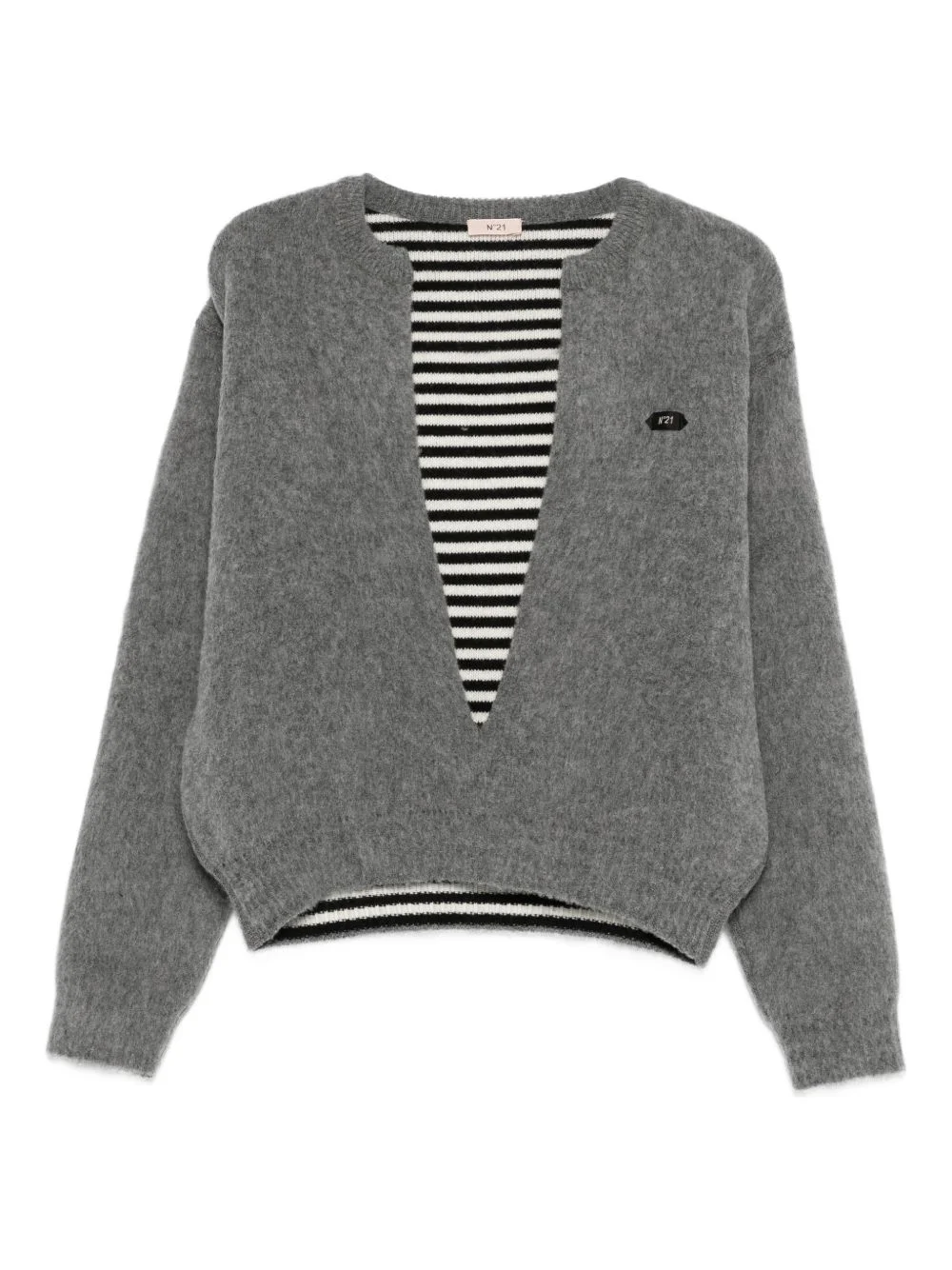 plunging V-neck sweater Highlights - Grey - Striped lining - Logo patch - Ribbed hem - Ribbed cuffs Made in Italy Composition Virgin Wool 98%, Polyamide 2% SIZE & FIT Model measurements Height 5 ft 10 in(1.78 m) Bust/Chest 33.46 in(85 cm) Hips 36.22 in(92 cm) Waist 23.22 in(59 cm) Washing instructions Hand Wash