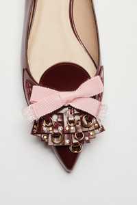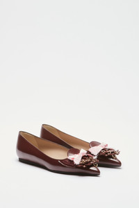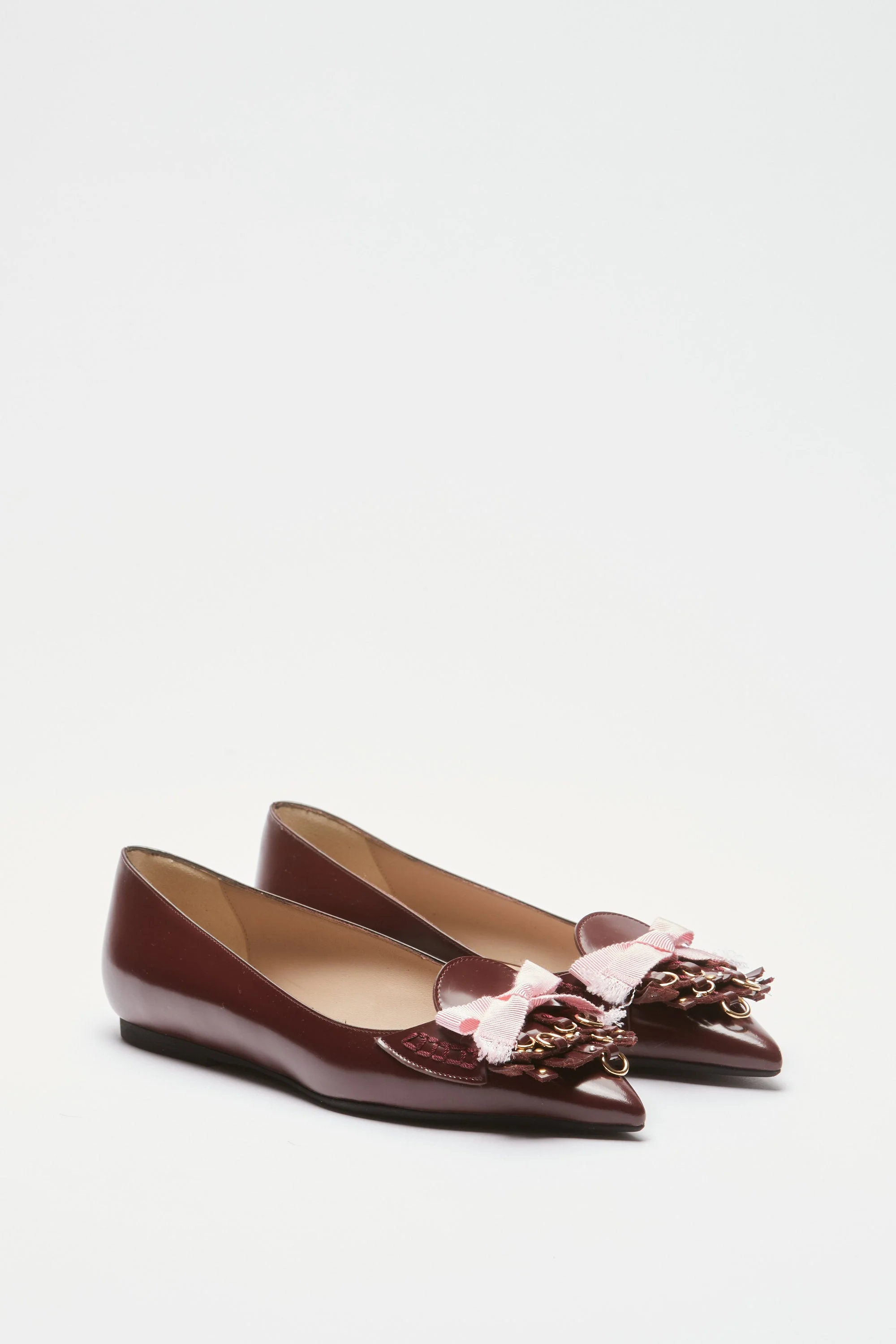 These pointed-toe ballerinas with fringe and studs are made of dark brown shiny leather. They feature a pointed toe and a front embellishment of fabric fringe and metal stud details. The low-cut fit is snug, with a flat sole. DETAILS Color: Bordeaux External composition: 100% CALF LEATHER Product Code: 25IGPBL012SZ1R005 Made in Italy SIZE AND VESTIBILITY Heel size: 10
