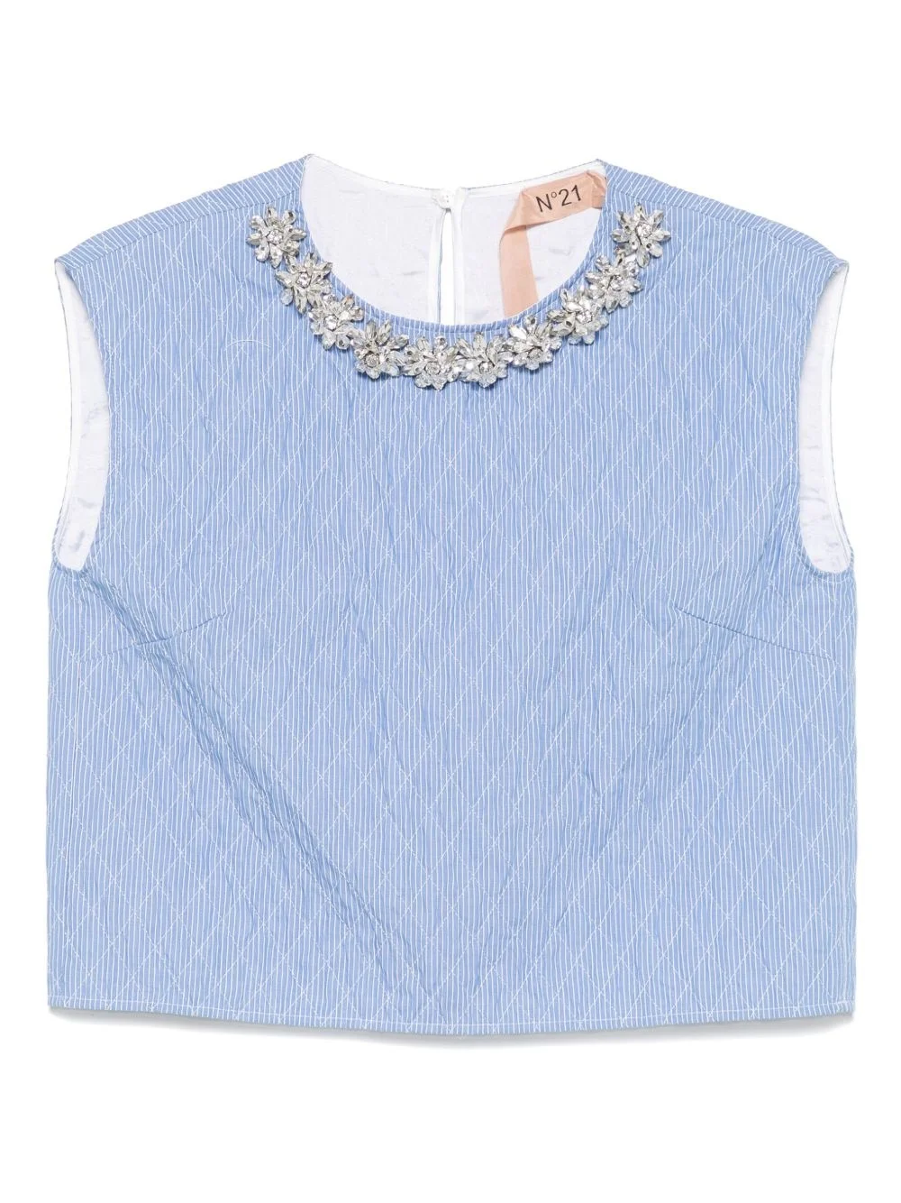 quilted top Highlights - Light blue - Single rear button fastening - Crew neck - Sleeveless - Crystal embellishment Made in Italy Composition glass 60%, Cotton 55%, Viscose 45%, Metal 40% SIZE & FIT Model measurements Height 5 ft 11 in(1.8 m) Bust/Chest 32.67 in(83 cm) Hips 35.82 in(91 cm) Waist 25.98 in(66 cm) FittingInformation Designed for a relaxed fit, this piece allows for comfort and movement when worn Made from a midweight non-stretch fabric