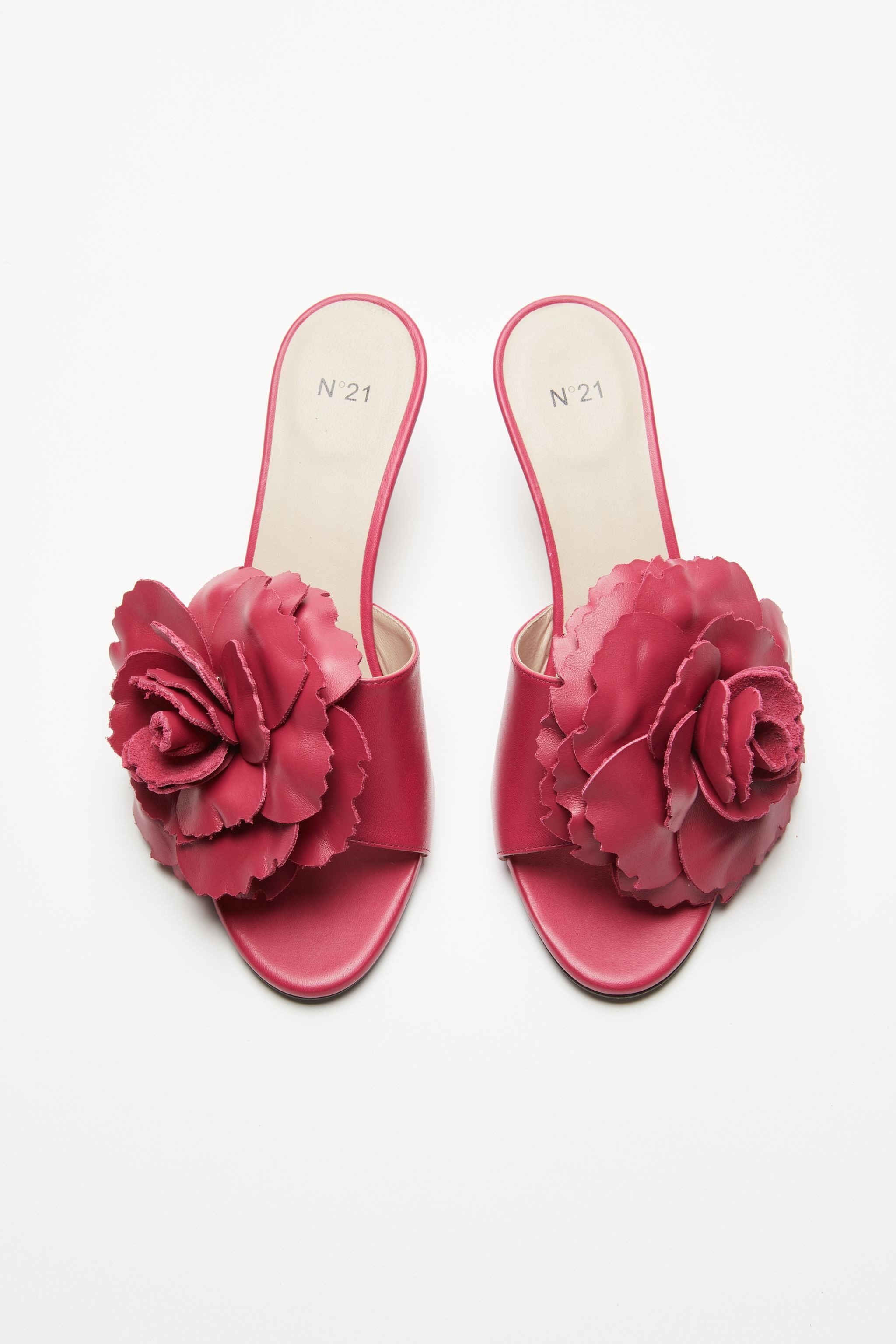 PINK MULES WITH A ROSE-EMBELLISHED FRONT STRAP. MID FLUTED HEEL. ROUND OPEN TOE.