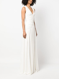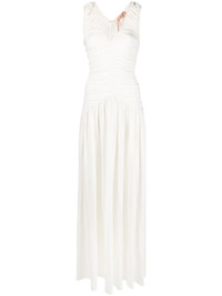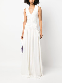 ruched-detailing long dress Highlights - Cream white - Stretch-design - Ruched bodice - V-neck - Sleeveless - Rear zip fastening - Fitted waistline - Flared skirt - Floor-length Imported Composition Viscose 72%, Polyester 22%, Elastane 6% SIZE & FIT Model measurements Height 5 ft 10 in(1.77 m) Bust/Chest 31.49 in(80 cm) Hips 36.22 in(92 cm) Waist 22.44 in(57 cm) FittingInformation Designed for a close fit throughout Particularly long in length; consider your own measurements Made from a midweight stretch fabric, this piece offers elasticity and flexibility when worn This piece fits true to size – take your usual size
