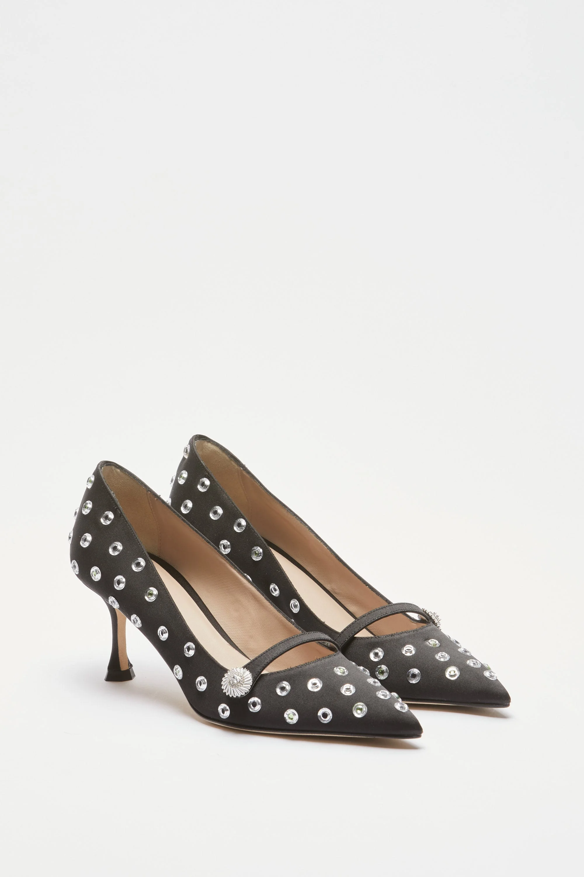 Black satin pumps with a pointed toe and medium stiletto heel. The style features a band fastening with a decorative button and all-over metal studs. The snug fit, smooth uppers and meticulous finishes create an elegant and modern design. DETAILS Color: Black External composition: 100% SATIN Product Code: 25IGPPM005RH1N001 Made in Italy SIZE AND VESTIBILITY Heel size: 60