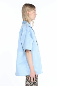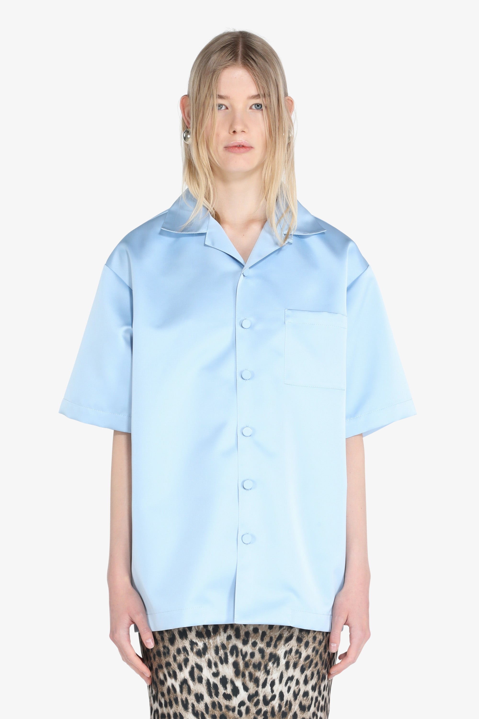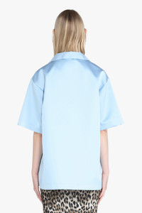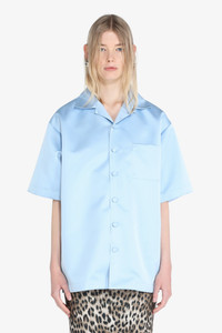 Sky-blue satin shirt with drop shoulders. Spread collar. Short sleeves. Patch chest pockets. Button front fastening. DETAILS Sky blue Regular fit 100% polyester Made in Italy Style ID: 25EN2M0G05252796380 SIZE AND VESTIBILITY Model is 178cm and wears size S