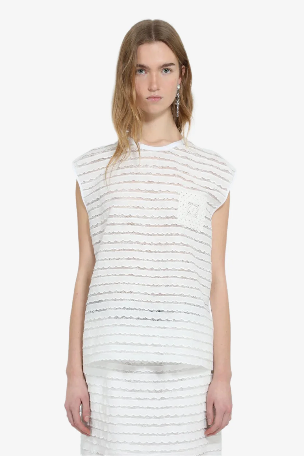 Sleeveless top in white lace with wavy stripes. Patch pocket on the chest. Simple crew neck. DETAILS Color: Optical White Composition: 75%CO 25%PA Product Code: 25IN2C0F06141571101 SIZE AND VESTIBILITY FIT TRUE TO SIZE