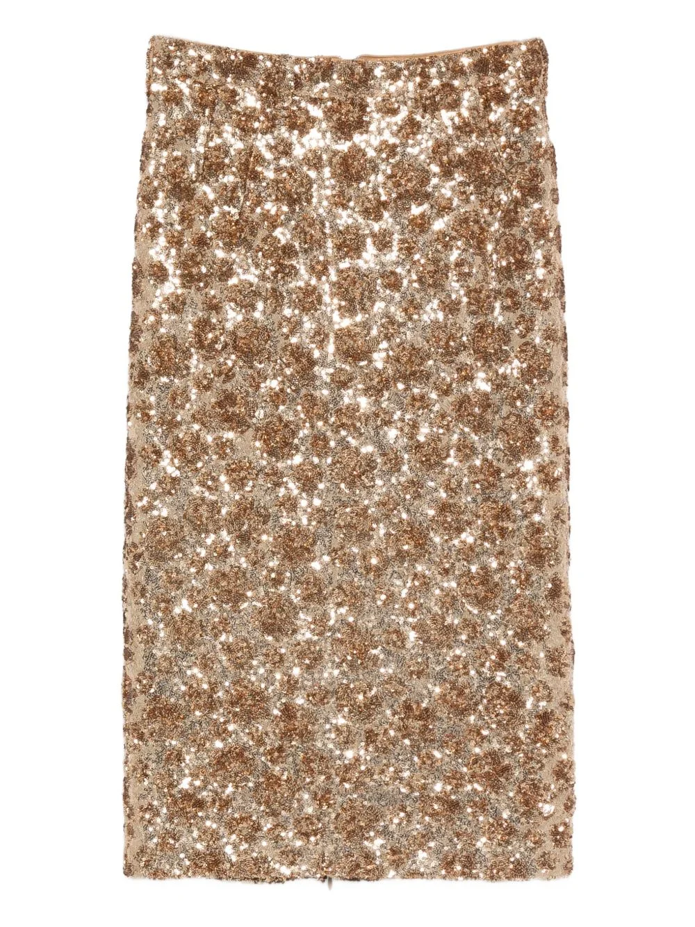 sequin-embellishment midi skirt Highlights - Gold-tone - Sequin embellishment - Zip fastening - Midi-length Made in Italy Composition Polyester 100% SIZE & FIT Model measurements Height 5 ft 11 in(1.8 m) Bust/Chest 31.49 in(80 cm) Hips 36.61 in(93 cm) Waist 24.4 in(62 cm) Washing instructions Read Manufacturer Guidelines