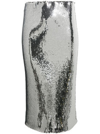 sequin midi skirt Highlights - Silver-tone - Stretch-design - Sequin design - High waist - Elasticated waistband - Unlined - Straight hem - Knee-length Made in Italy Composition Polyester 96%, Elastane 4% SIZE & FIT Model measurements Height 5 ft 9 in(1.75 m) Bust/Chest 34.64 in(88 cm) Hips 36.61 in(93 cm) Waist 26.37 in(67 cm) FittingInformation This midi-length skirt is intended to be worn high on the waist The elasticated waist allows for a comfortable fit Made from a midweight stretch fabric, this piece offers elasticity and flexibility when worn