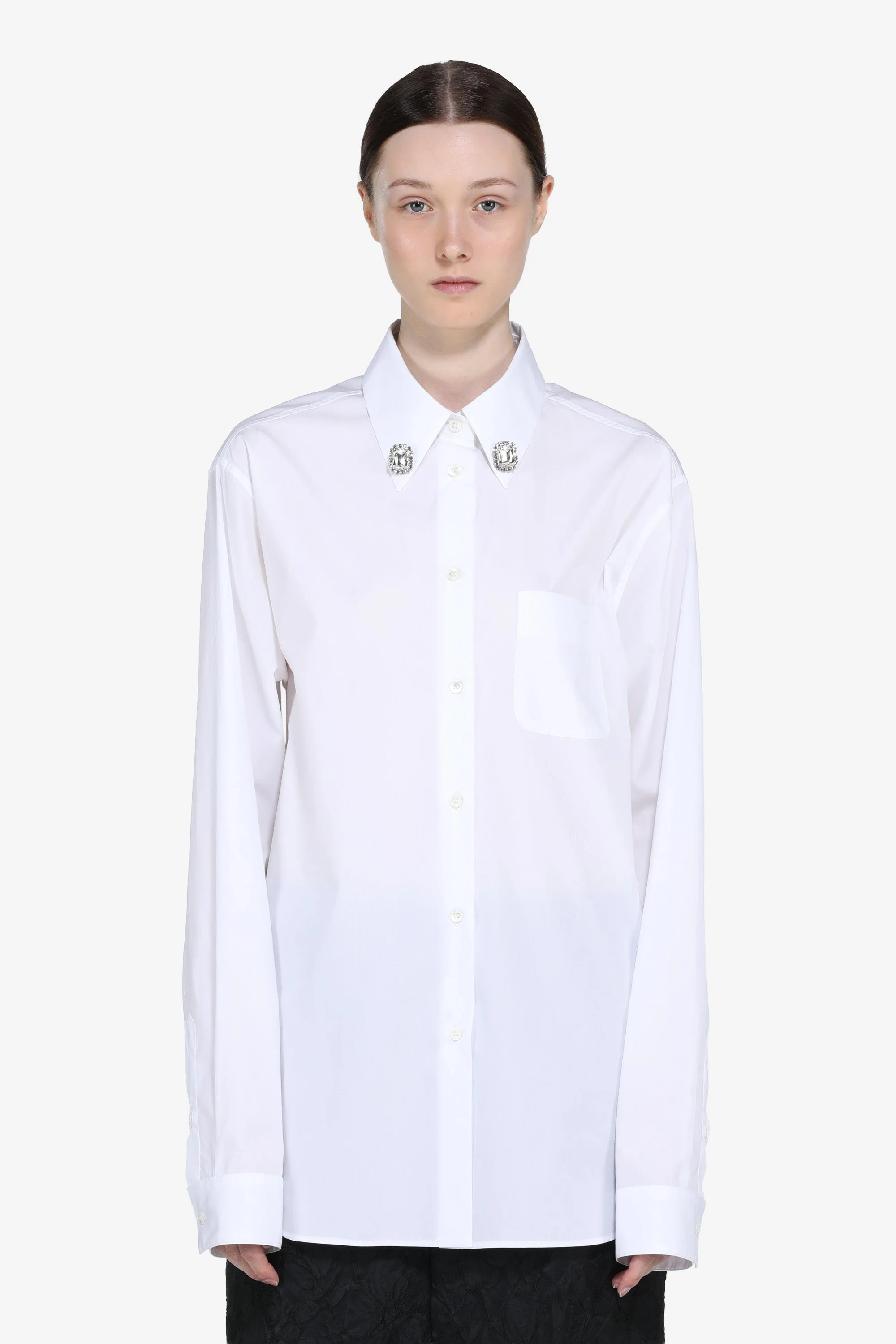 White long-sleeved shirt. Collar with appliques at the tips. Front button closure and left chest pocket. Straight fit, long sleeves with buttoned cuffs. DETAILS Color: Optical White Composition: 100%CO Product Code: 26EN2M0G02101871101 Made in Italy SIZE AND VESTIBILITY The model wears size S and is 179 cm tall. The boss fits regular.