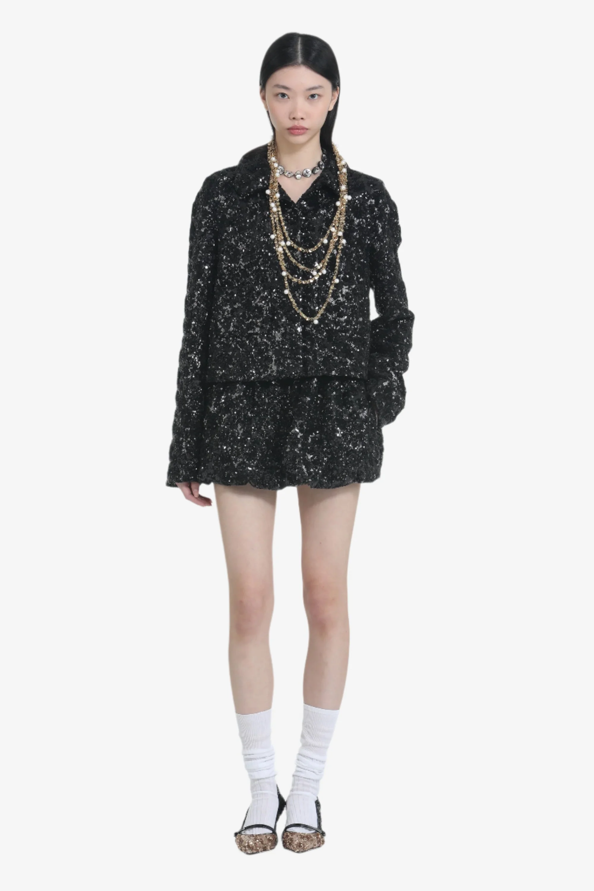 Cropped jacket made of black sequined fabric. It features a regular fit, clean lines, and a compact construction. It features a classic collar and integrated front pockets. The garment is characterized by a uniformly shiny effect thanks to the sequins applied across the entire surface. DETAILS Color: Black Composition: 100% PL Product Code: 25IN2M0L02452659000 Made in Italy SIZE AND VESTIBILITY The model wears size 40. The item fits oversized.
