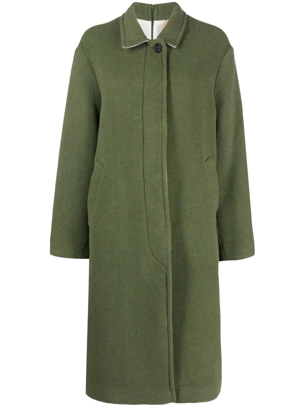 single-breasted wool blend coat Highlights - Moss green - Wool blend - Felted - Cutaway collar - Concealed front button fastening - Concealed rear zip fastening - Drop shoulder - Long sleeves - Two side welt pockets Imported Composition Wool 50%, Acrylic 23%, Polyester 22%, Other fibres 5% Washing instructions Dry Clean Only