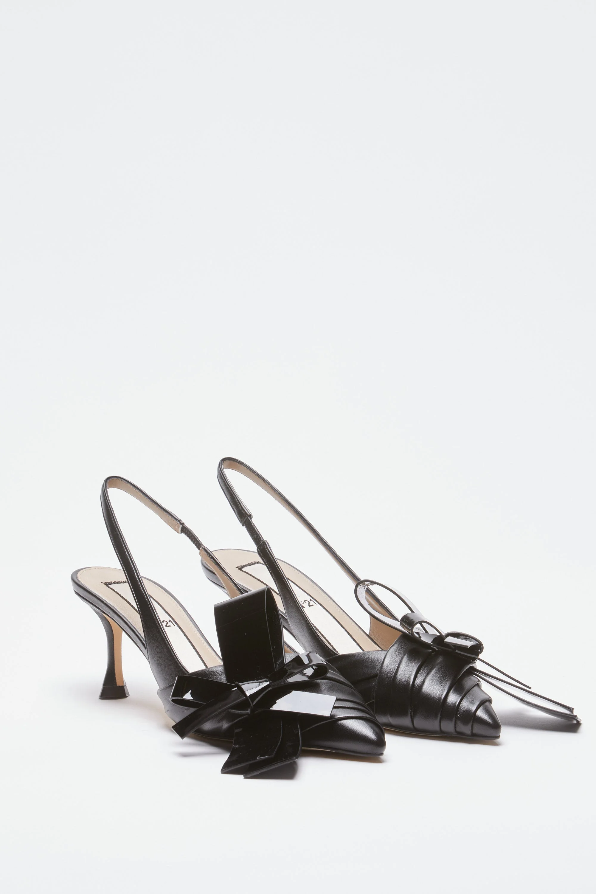 The Bow Slingback is an elegant shoe crafted from black synthetic leather and featuring a low stiletto heel. It features a heel closure for a secure fit and a decorative bow on the front that adds a touch of sophistication. The tapered toe adds a sophisticated look, making it suitable for special occasions or everyday wear. This shoe is designed to offer comfort and style with every step. DETAILS Color: Black External composition: 100% LAMB LEATHER Product Code: 25IGSSB012NPVN001 Made in Italy SIZE AND VESTIBILITY Measurements: 60