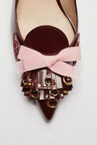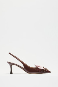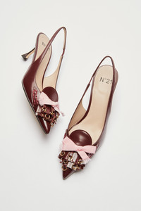 Brown patent leather slingback with fringe and studs and a medium stiletto heel. The shoe features a pointed toe and an elasticated back strap for a secure fit. Decorative front details with pink fringe and metal studs add a distinctive touch to the design. A leather sole and tailored construction ensure optimal comfort and durability. DETAILS Color: Bordeaux External composition: 100% CALF LEATHER Product Code: 25IGPSB008SZ1R005 Made in Italy SIZE AND VESTIBILITY Heel size: 60