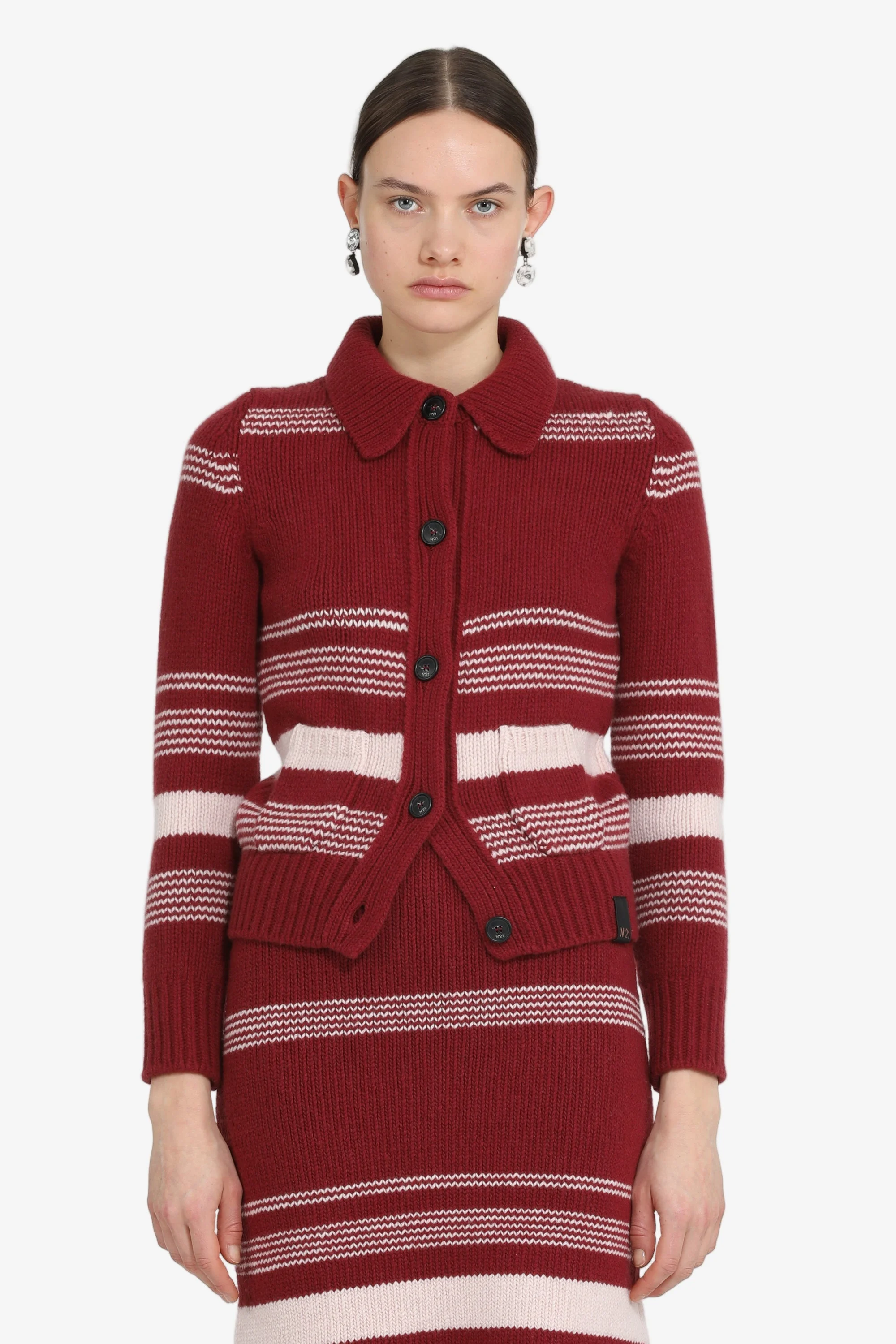 Striped cardigan with a collar made of a thick, ribbed knit. It features a front button closure and two side pockets. The fitted design flatters the figure, while the horizontal burgundy and light pink stripes create a graphic effect. The cuffs and hem are ribbed for added comfort and a snug fit. DETAILS Color: Dark Red Composition: 100%WV Product Code: 25IN2M0A01270814601 Made in Romania SIZE AND VESTIBILITY The model wears size 40. The item fits oversized.