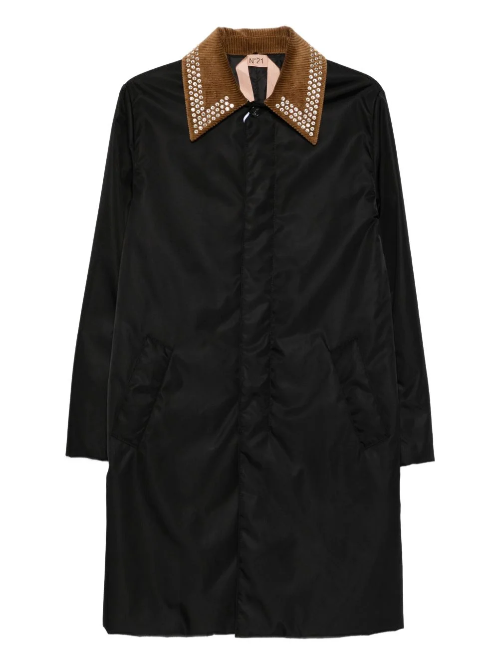 studded-embellishment coat Highlights - Black - Studded embellishment - Corduroy collar - Pointed collar - Button fastening - Welt pockets Made in Italy Composition Outer: Cotton 100%, Polyamide 100%, glass 80%, Metal 20% Lining: Polyamide 100% Washing instructions Machine Wash