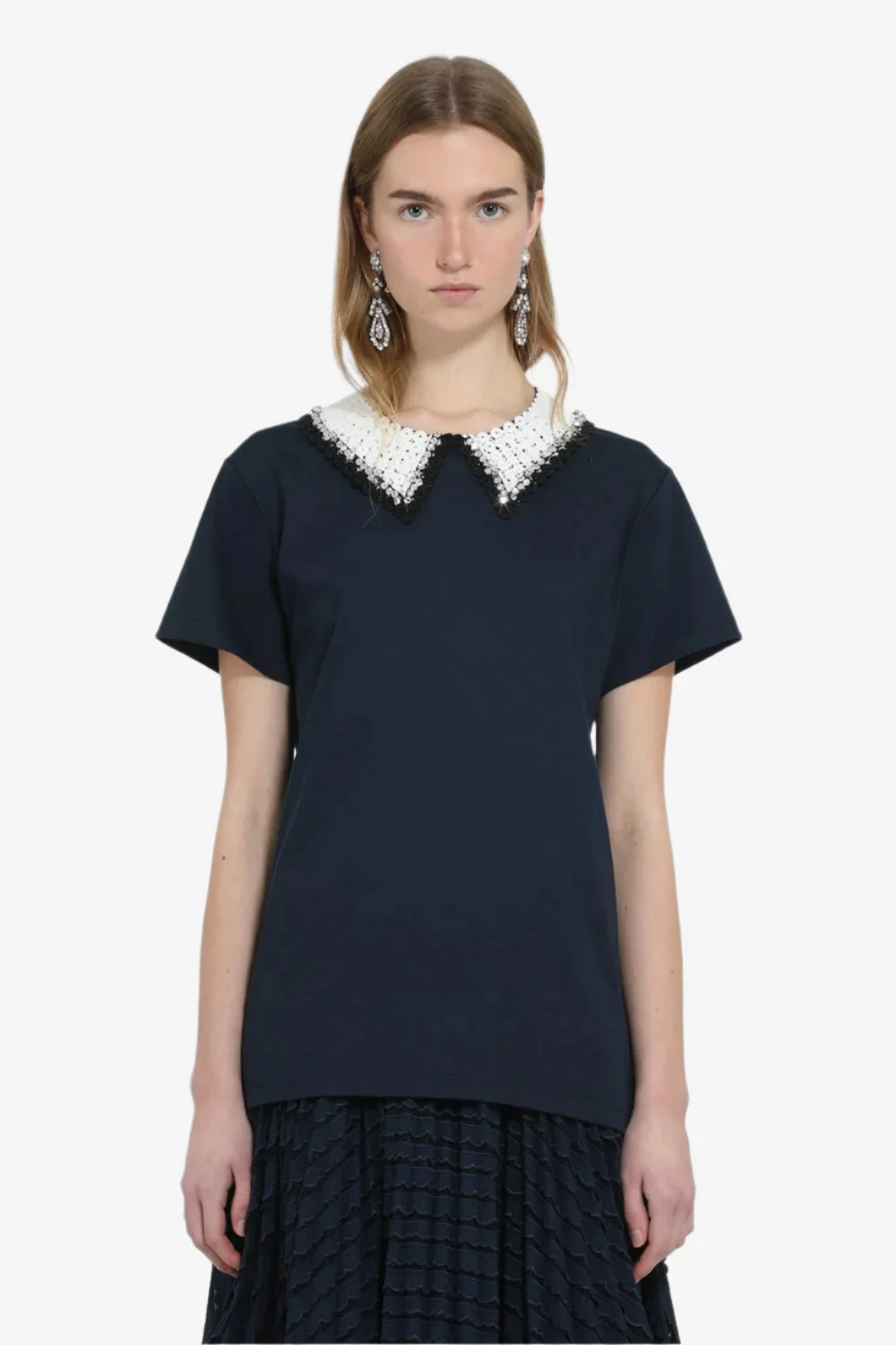 Black cotton T-shirt with short sleeves and embroidered collar with white details and sequins. DETAILS Color: Blue Composition: 95%CO 3%PL 2%CZ Product Code: 25IN2C0F07141576479 SIZE AND VESTIBILITY The model wears size S. The item fits regular.