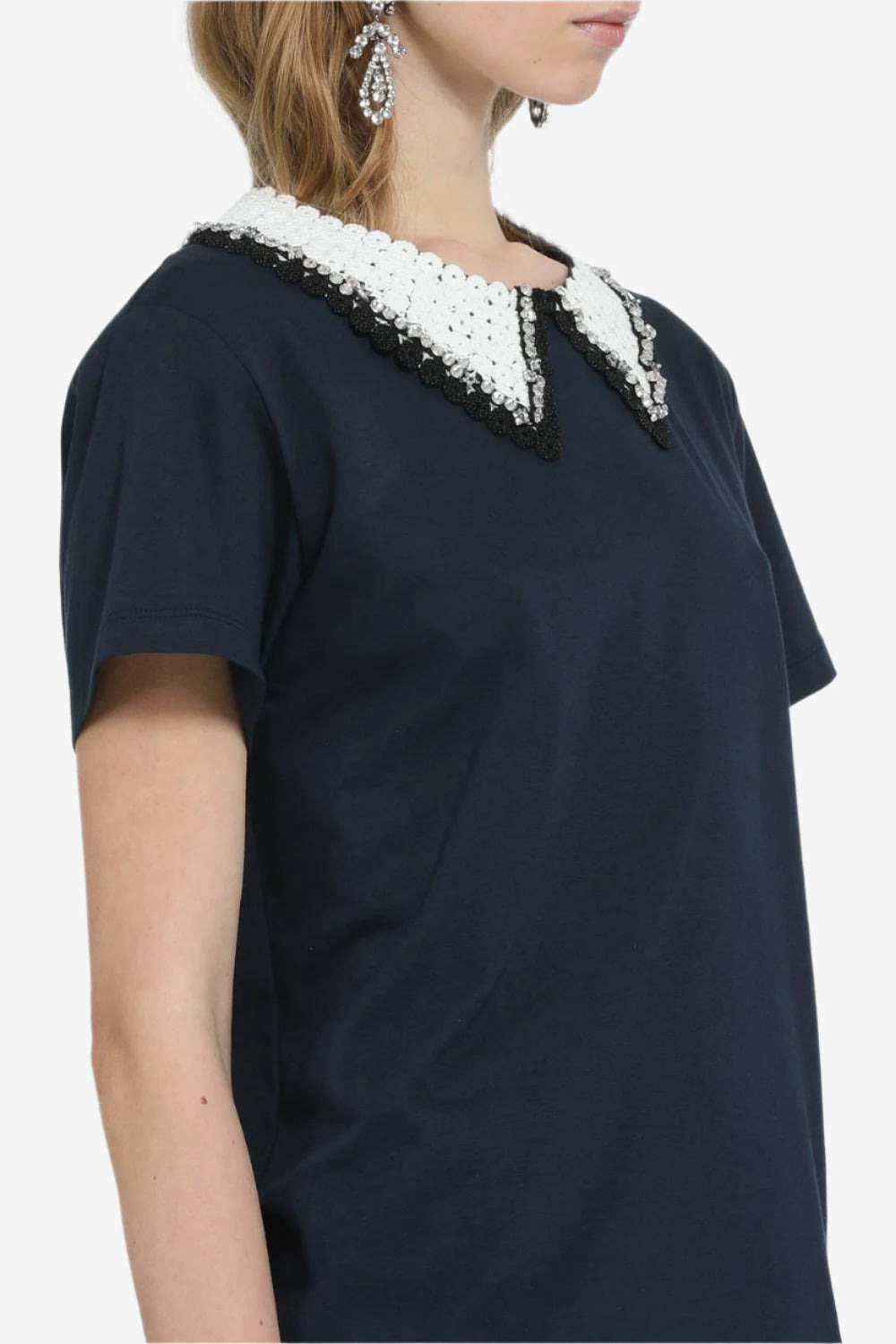 Black cotton T-shirt with short sleeves and embroidered collar with white details and sequins.