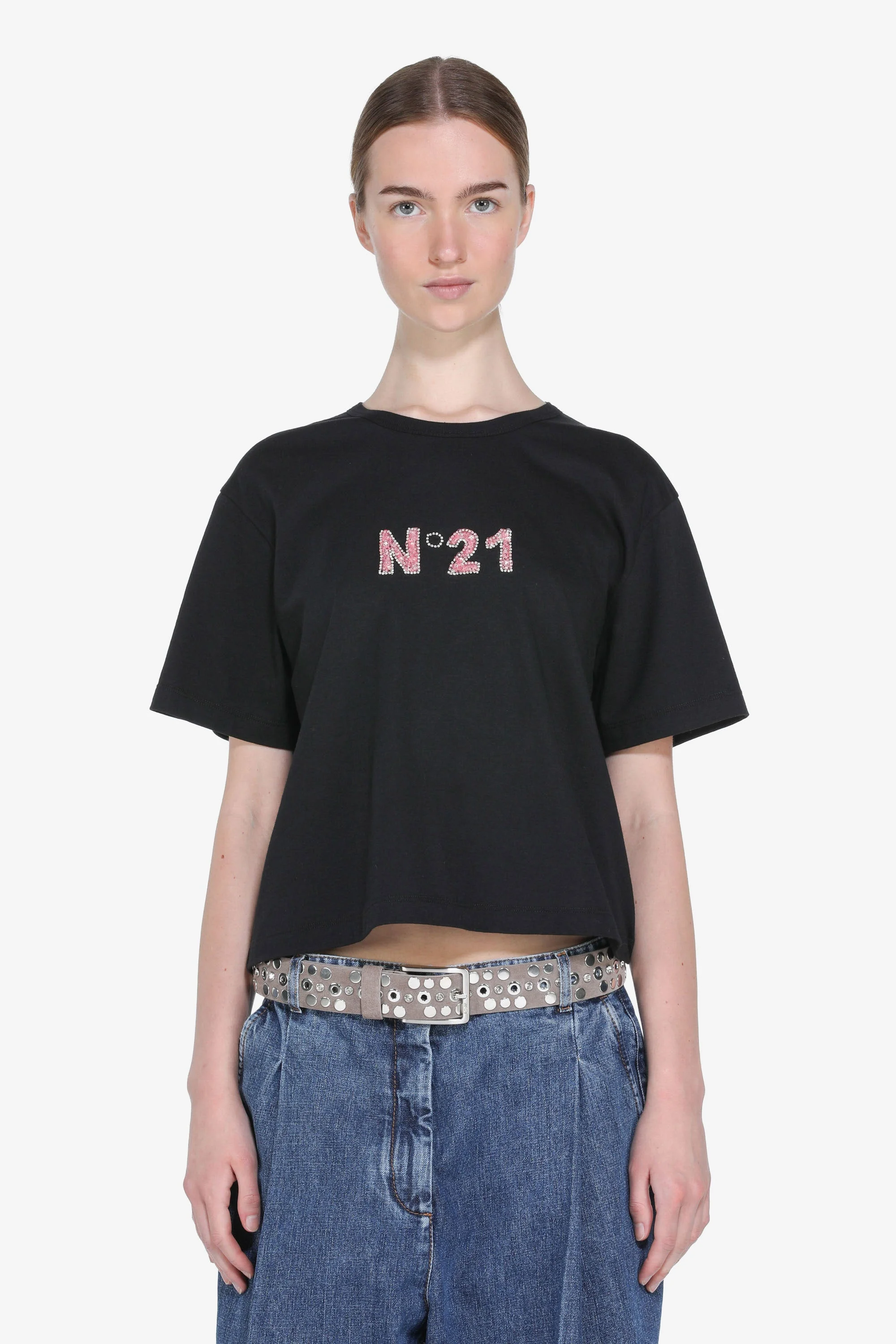 Black, short-sleeved, round-neck cropped T-shirt. The N21 logo features on the front with pink sparkly elements in the center. Relaxed fit. DETAILS Color: Black Composition: 90%CO 8%PL 1%VT 1%ME Product Code: 26EN2M0F01241579000 Made in Albania SIZE AND VESTIBILITY The model wears size S and is 177 cm tall. The garment fits oversized.