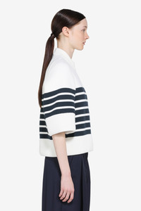 Three-quarter-sleeve knit sweater. The piece is white with horizontal navy stripes across the chest and sleeves. The high, ribbed collar and hem and cuffs are also ribbed. The relaxed fit reaches just below the hips. DETAILS Color: Milk White Composition: 47%PL 31%CO 19%PA 3%EA Product Code: 26EN2M0A00776011103 Made in Italy SIZE AND VESTIBILITY The model wears size S and is 179 cm tall. The garment fits oversized.
