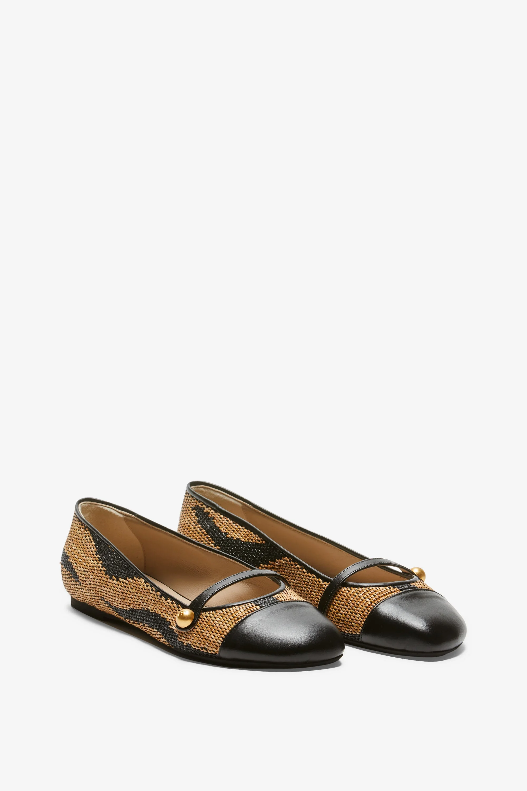 Round-toe ballerinas in two-tone woven fabric. The upper combines beige and black tones with a black leather toecap. A thin black band runs across the front and features a small gold button detail on the outside. Neutral lining and flat sole. DETAILS Color: Tiger Print External composition: 80% CO 20% GOAT LEATHER Product Code: 26EGPBL031RZ1X002 Made in Italy